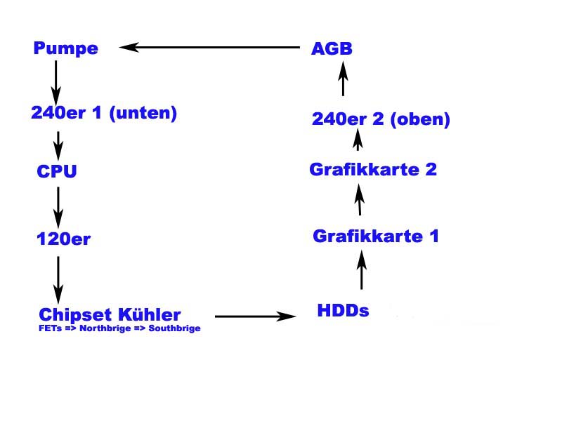 - Nachmöglichkeit von ein ander getrennte Kreisläufe für CPU, MB und Grafikkarten also trennen vor dem Bauteil und nach den Bauteilen wieder zusammenführen.