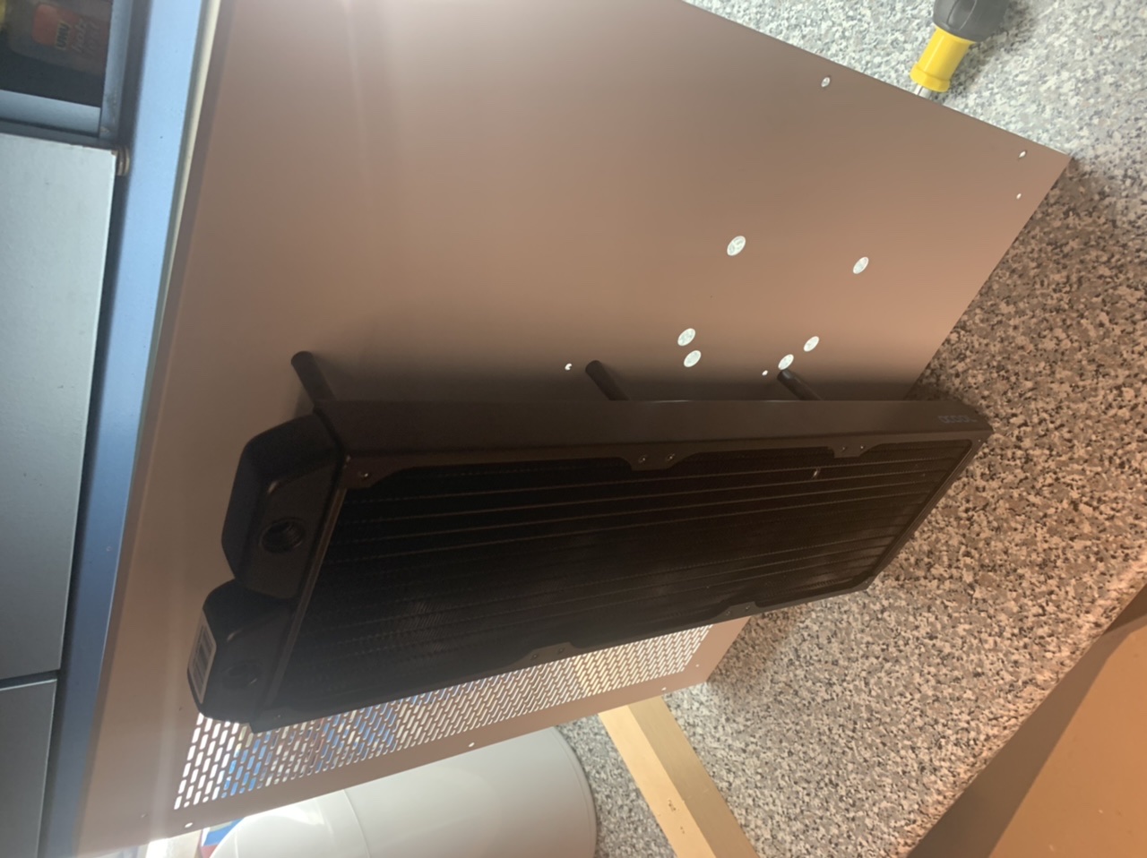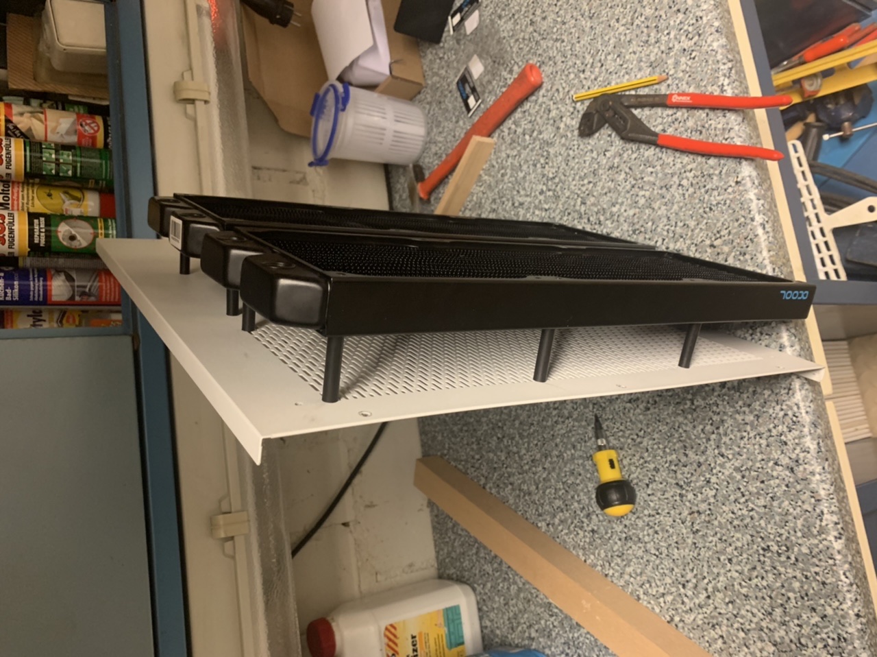 Ich habe mich dann dazu entschlossen, zwei 420er an die Seitenwand des Gehäuses anzubringen und eine Idee mit einem 420er Mo-Ra (mangels geeigneter Stellfläche) wieder verworfen.