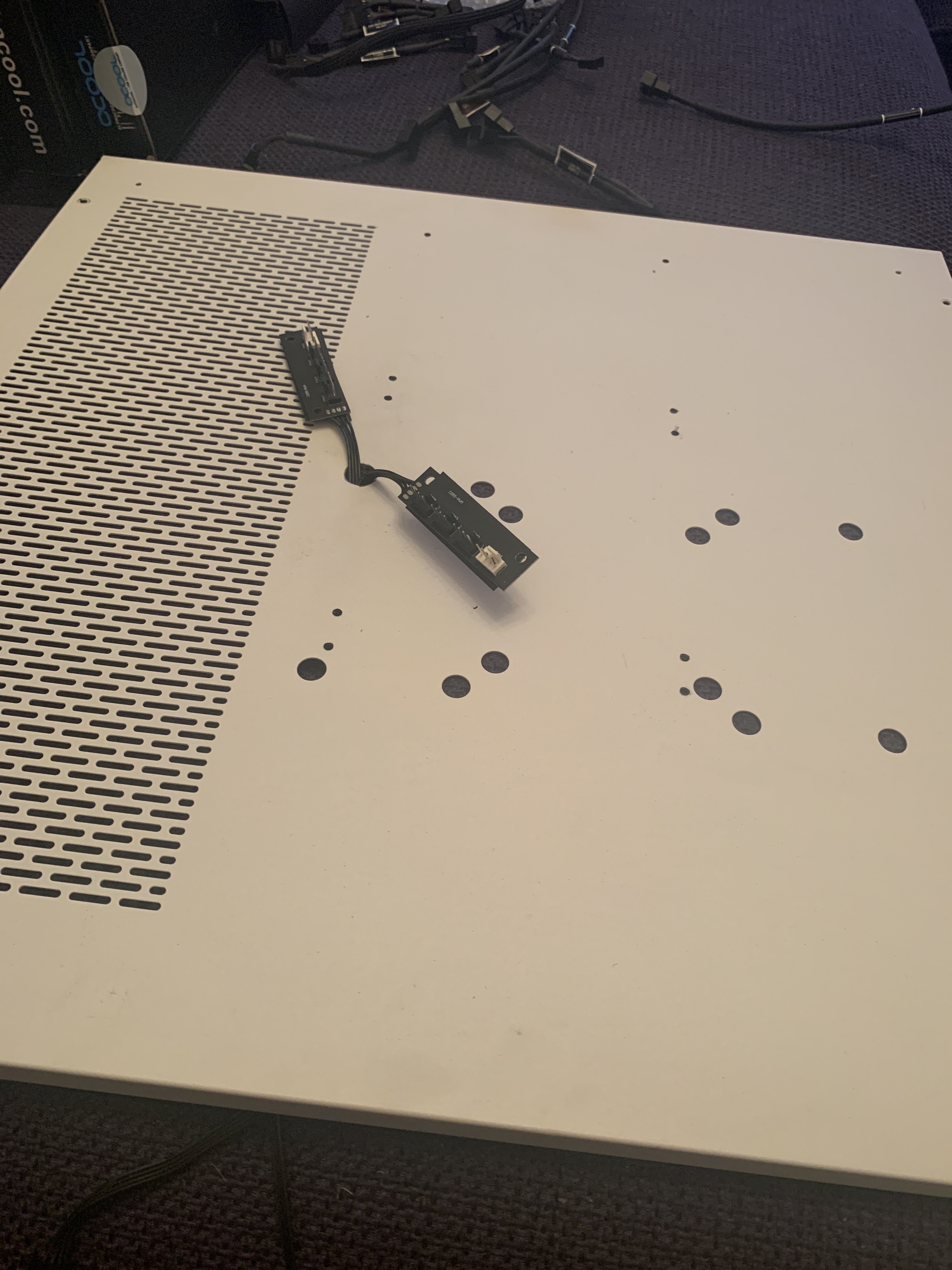 Hier sieht man die Seitenwand des Cases mit zusätzlichen Bohrungen für die M3-Radiatorschrauben und einer größeren Bohrung zur Durchführung der Lüfterkabel (inkl. zweier passiver 1:3 PWM-Splitter für die Lüfter.