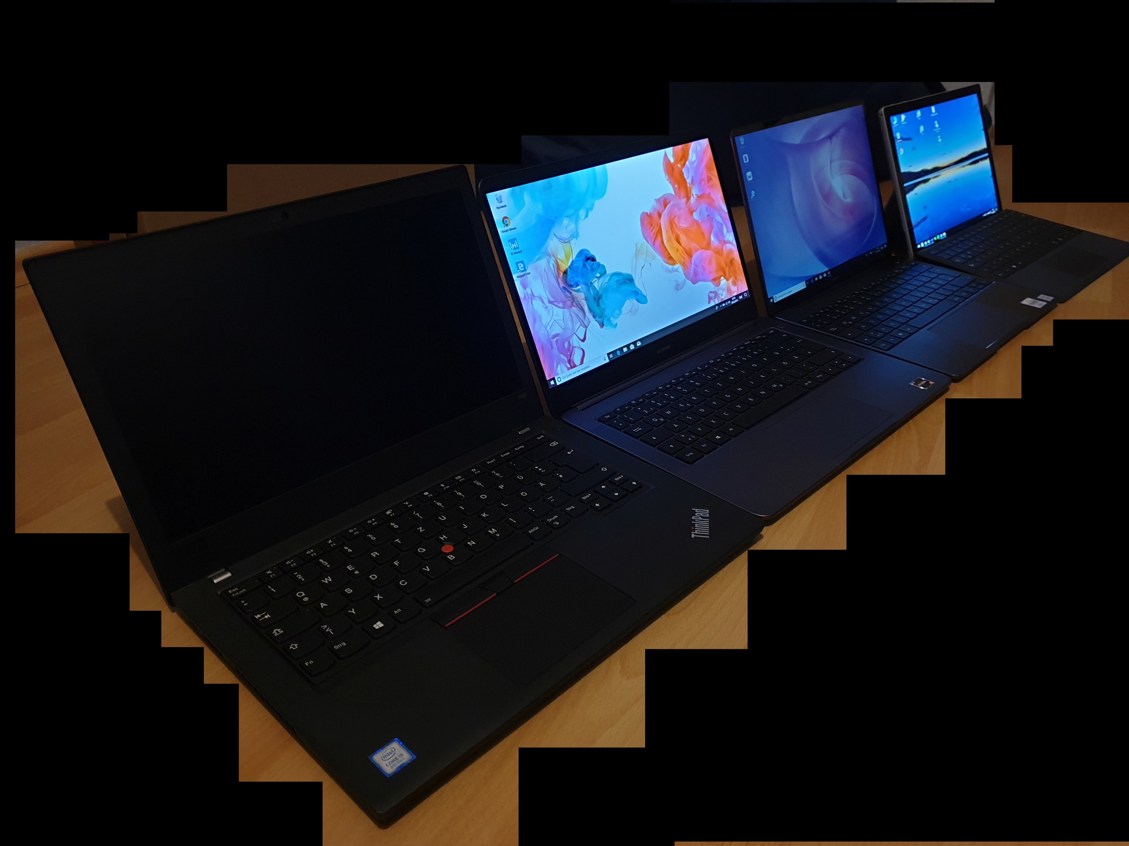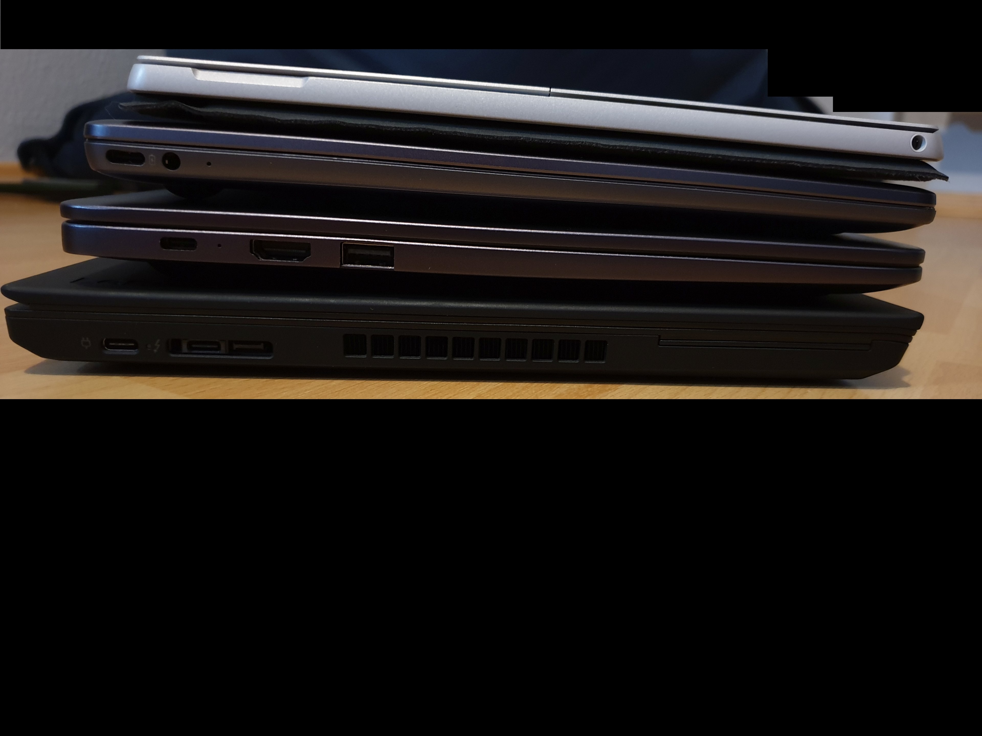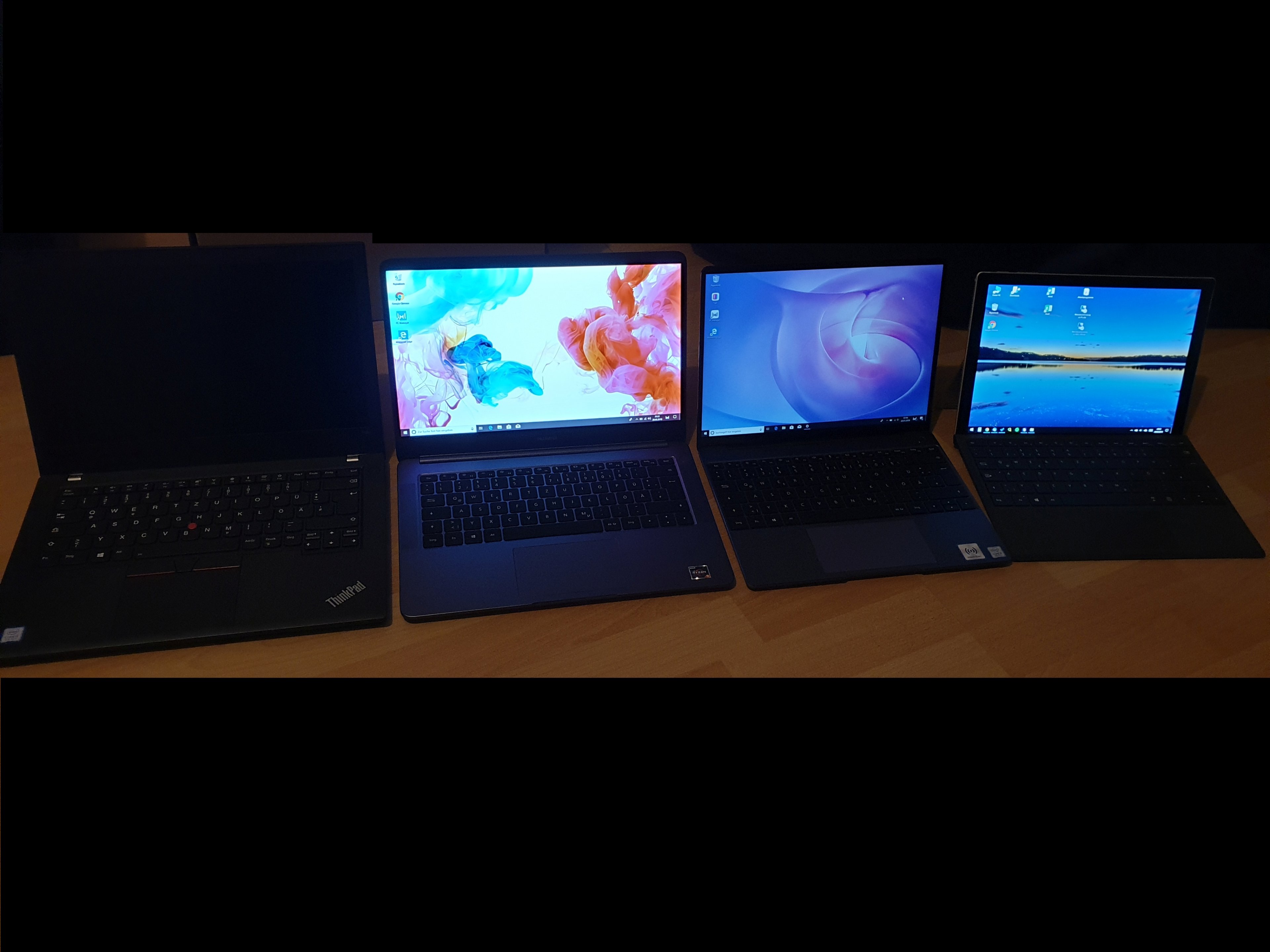 Auf den Fotos ist (von klein nach groß) das Surface Pro (mein aktuell genutztes Gerät), Matebook 13, Matebook D 14 und ein Lenovo T480 (von einem Freund ausgeliehen da das für mich auch in Frage kommt). Das Lenovo habe ich mir naiverweise ohne Ladegerät ausgeliehen und der Akku ist mittlerweile nach meinen Tests leer, von daher ist auf dem Gerät auf allen Fotos das Display aus.