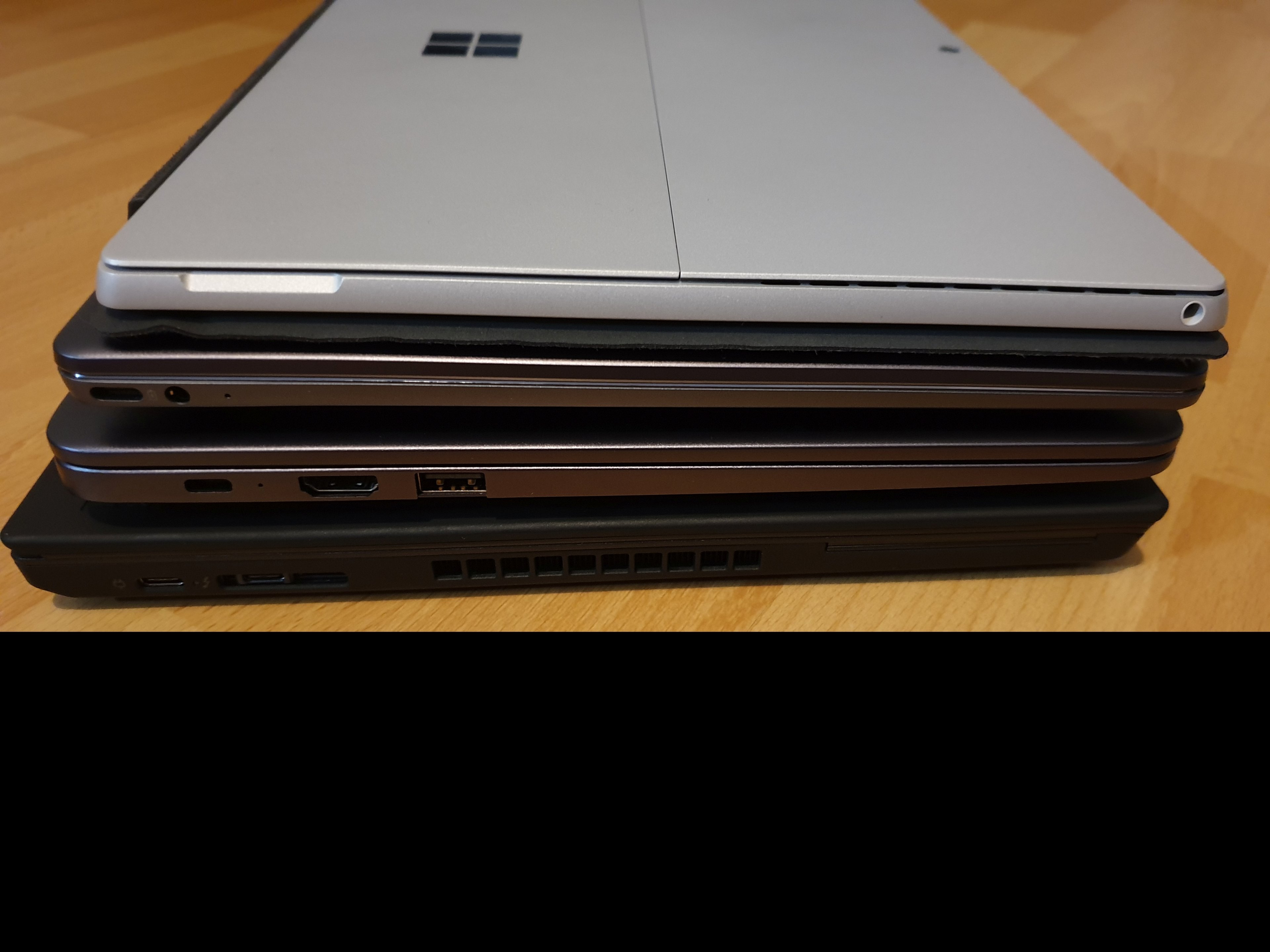 Höhe der Geräte von oben nach unten: Surface Pro 2017 (inkl. Type Cover), Matebook 13, Matebook 14, Lenovo T480