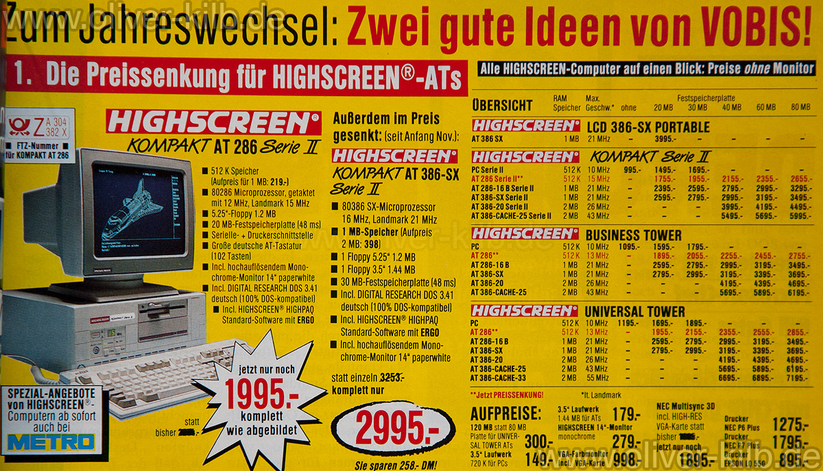 Nostalgie hin oder her (ich war damals 11 Jahre alt), heute stellt sich mir eine nüchterne Frage: Wurde meine Mutter über den Tisch gezogen? Die Preise wirken auf mich für Herbst 1990 extrem hoch. Ich habe mir inzwischen alte Computerzeitschriften aus der Zeit angesehen, und dort tauchen bereits 486er auf – teurer, ja, aber technologisch eine ganz andere Liga.