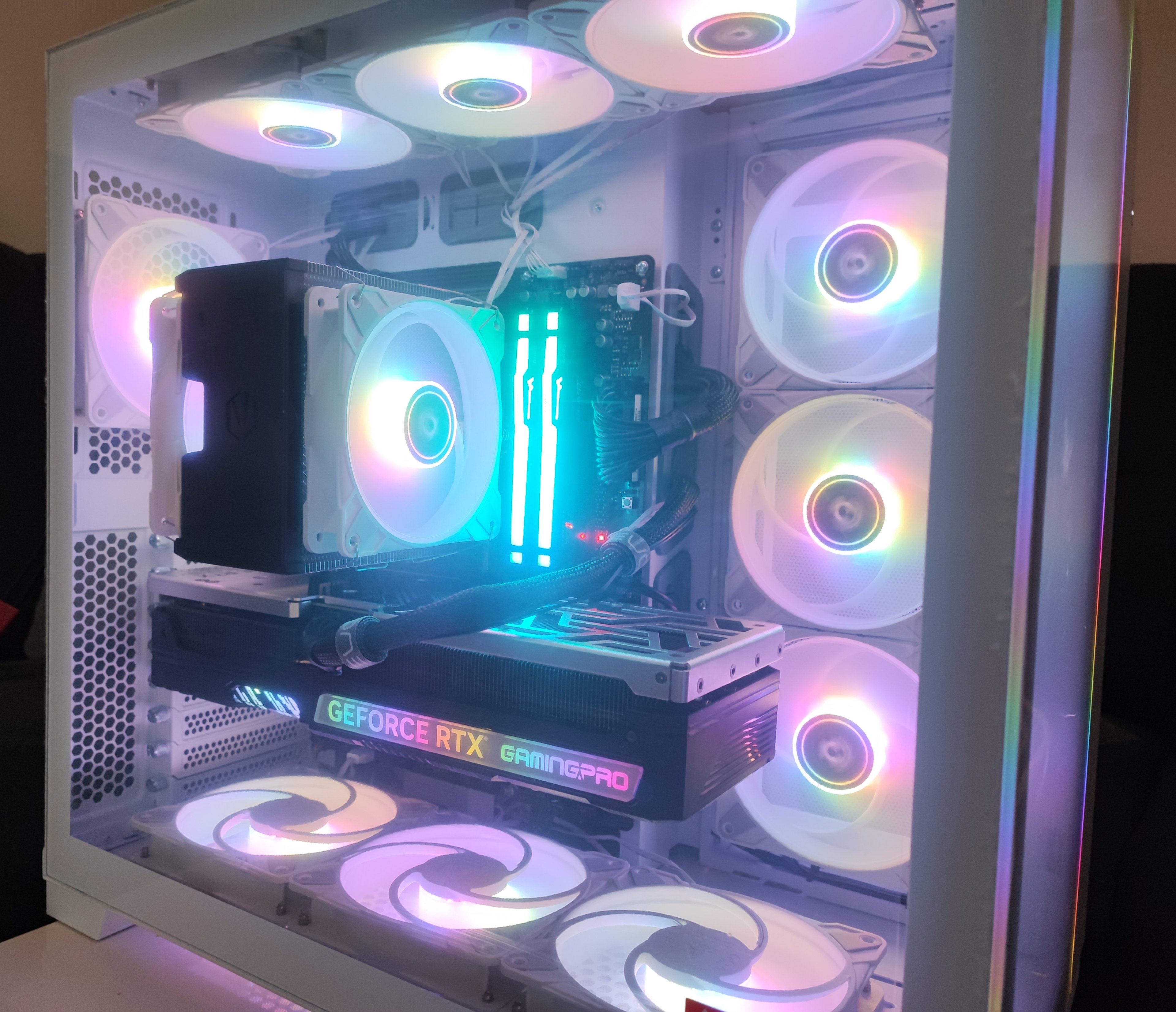 Soll mein erster RGB Gaming PC werden, daher ist der Wunsch von mir NZXT H9 Flow Schwarz Gehäuse zu nutzen, mit 10 Stk. Lian Li Uni Fan SL120 RGB Lüftern sowie NZXT Kraken Kühlung, möchte das ganze eher Schwarz halten und mit RGB Lüftern/RAM usw. etwas Farbe verpassen.