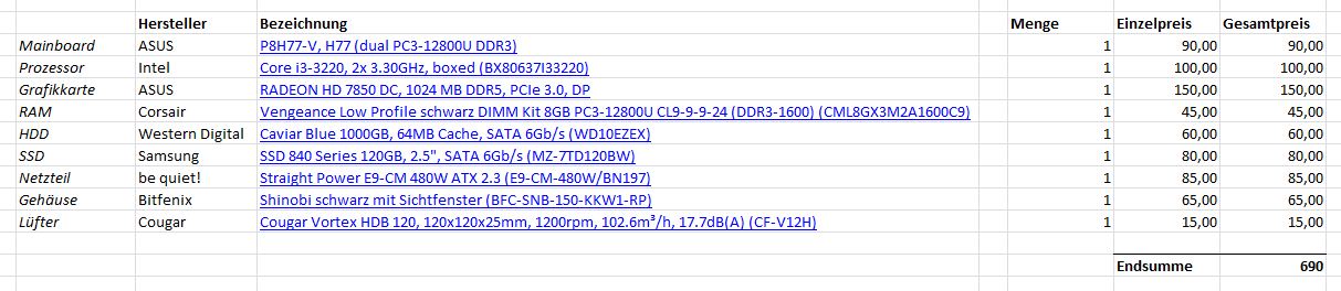 Geplant waren ca. 600€, aber da bin ich etwas drüber hinausgeschossen denke ich. Auch bin ich mir nicht sicher, ob die aktuelle Zusammenstellung jetzt angemessen oder eher übertrieben ist.