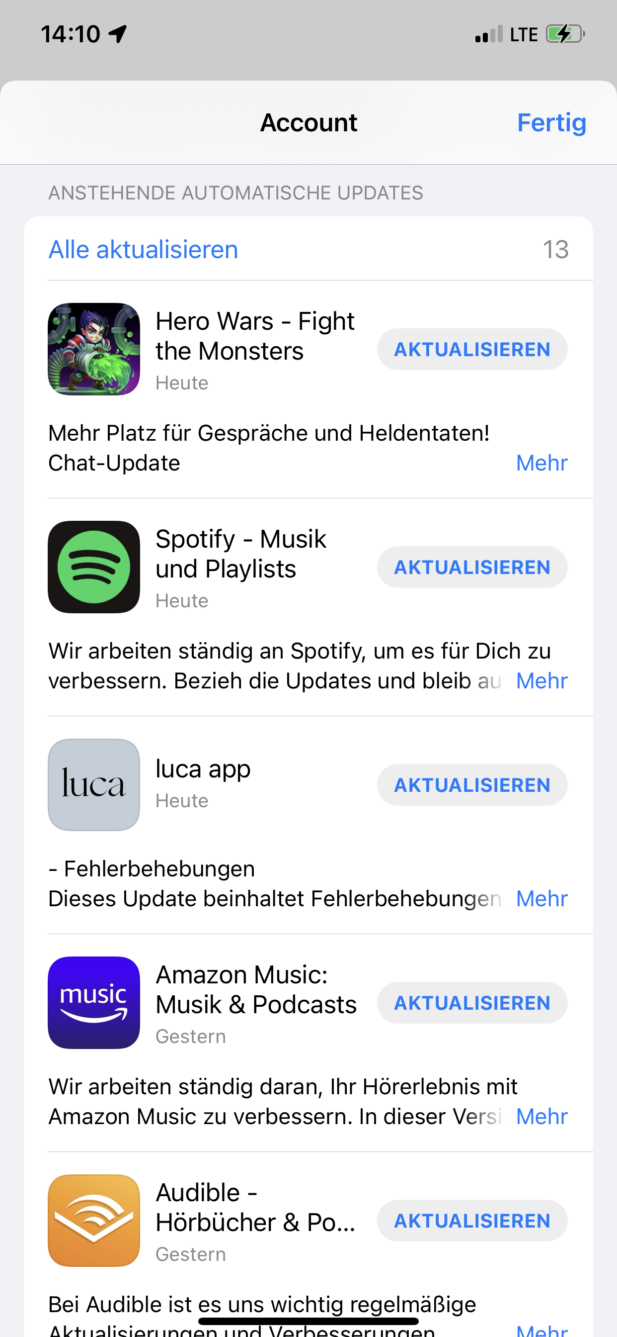 Auch hier siehst du Apps (10 von den 13) die seit gestern Updates haben. Ein Update in der Nacht auf dem QI Charger und WLAN fand trotzdem nicht statt.