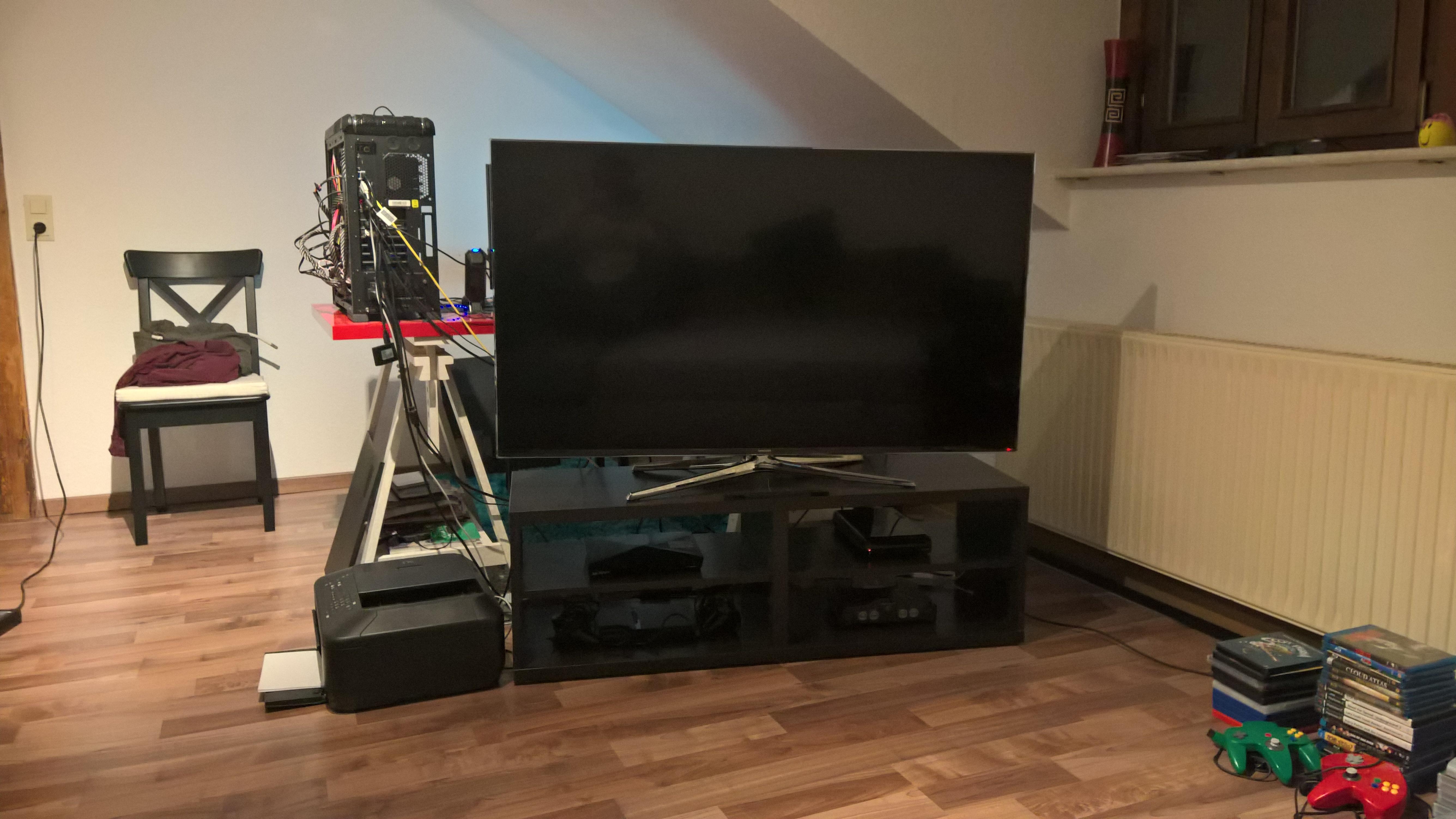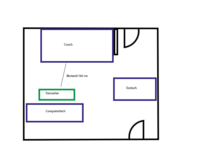 Der Sound meines Fernseher (Samsung 55Zoll) ist leider nicht der Beste und noch zum großen Übel steht der Fernseher nicht an einer Wand sondern mitten im Raum, siehe Zeichnung.