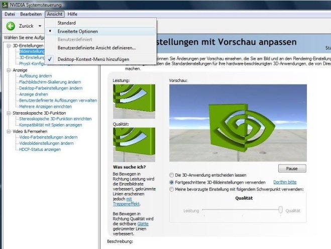 jedoch kann ich bei den systemsteuerungen von nvidia die erweiterten einstellungen nicht aktivieren, da der eintrag "ansicht" über dem man die erweiterten einstellungen aktivieren kann, nicht exestiert.. brauche die aber, damit ich die skalierung einstellen kann...