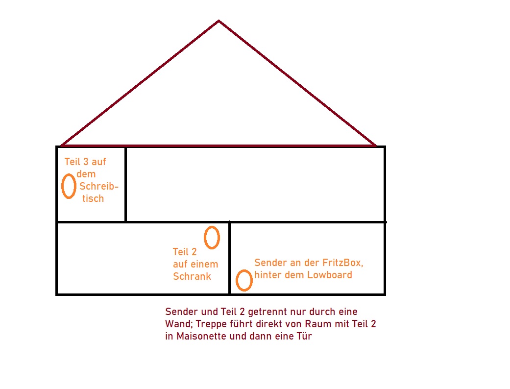 Der Empfängrr im oberen Stock hat nach wie vor immer wieder Probleme mit dem Empfang des Senders, der per LAN Kabel an unsere FRITZ!Box 7590 angeschlossen ist. Es handelt sich hier nicht um Stahlbetonwände sondern ganz normale Stein-/Porotonwände. Auch ist zwischen den Etagen eine große Wende Treppe so dass auch hier keine durchgehende Flächenversiegelung stören würde. Vielen Dank für eure Hilfe!