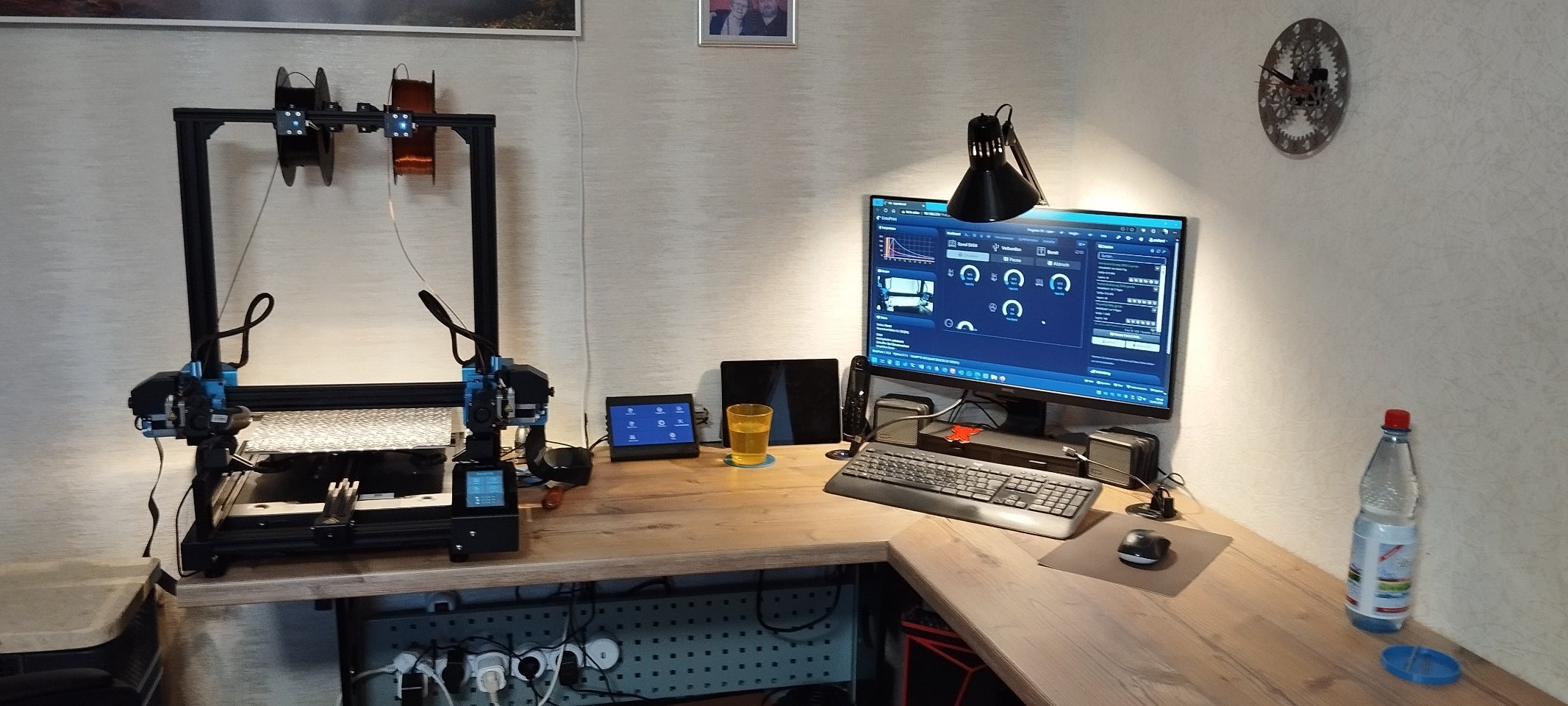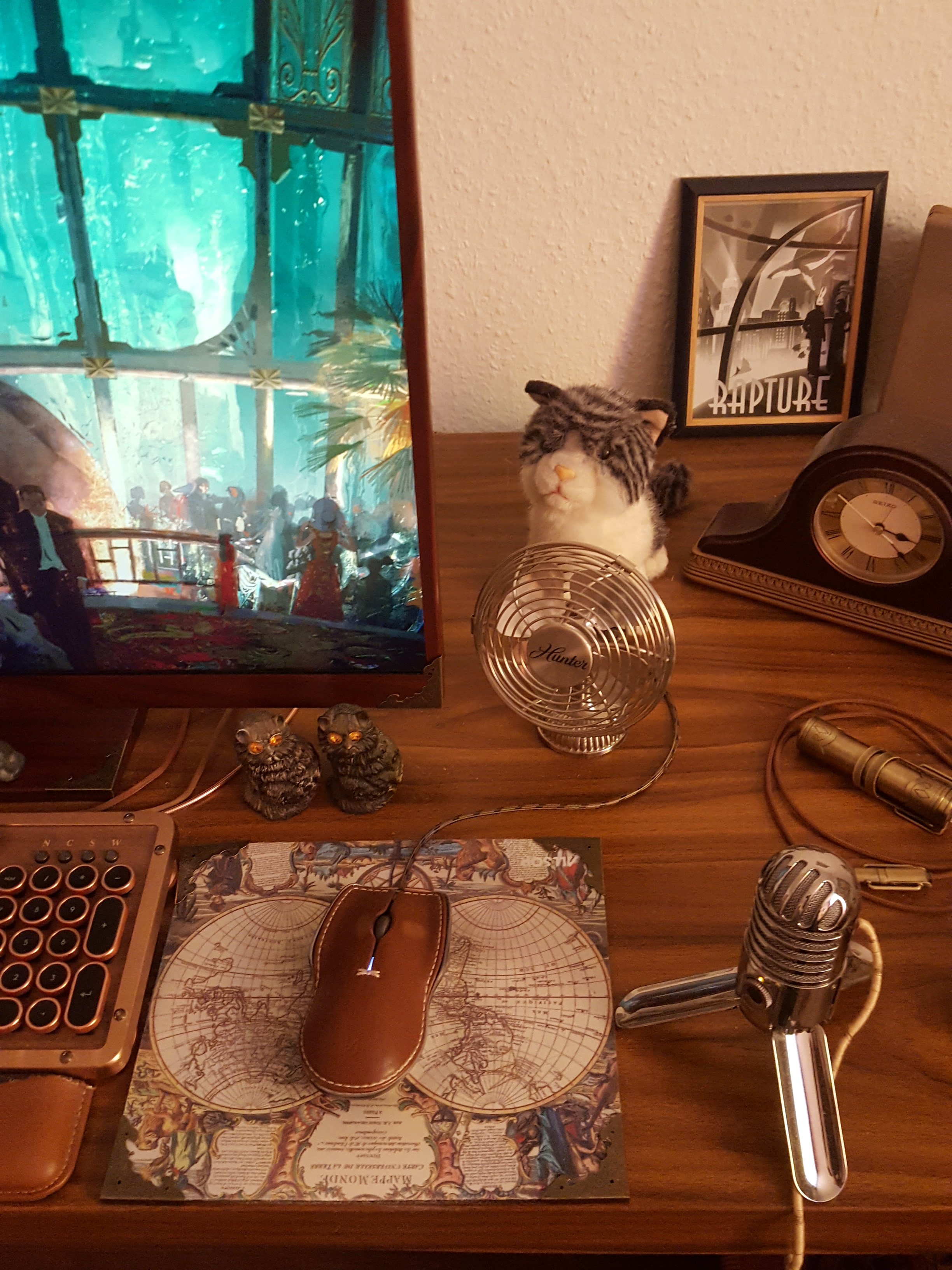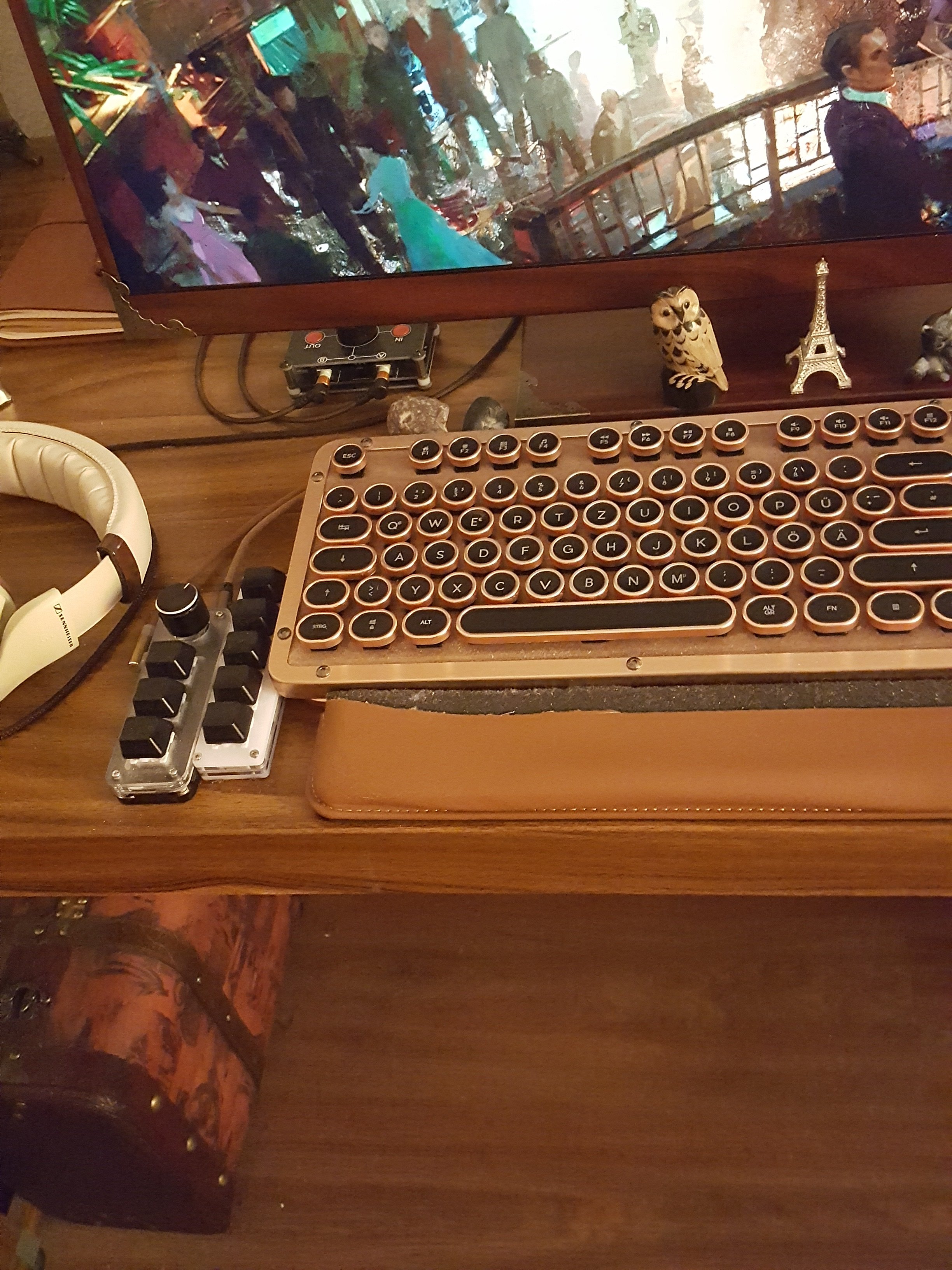 Der 24'' Monitor wurde inzwischen gegen einen 42 Zoll OLED ausgetauscht (der leider dünnen Rahmen hat, wodurch man wenig Holzfolie sehen kann) und der weiße PS4 Controller gegen einen "goldenen".
