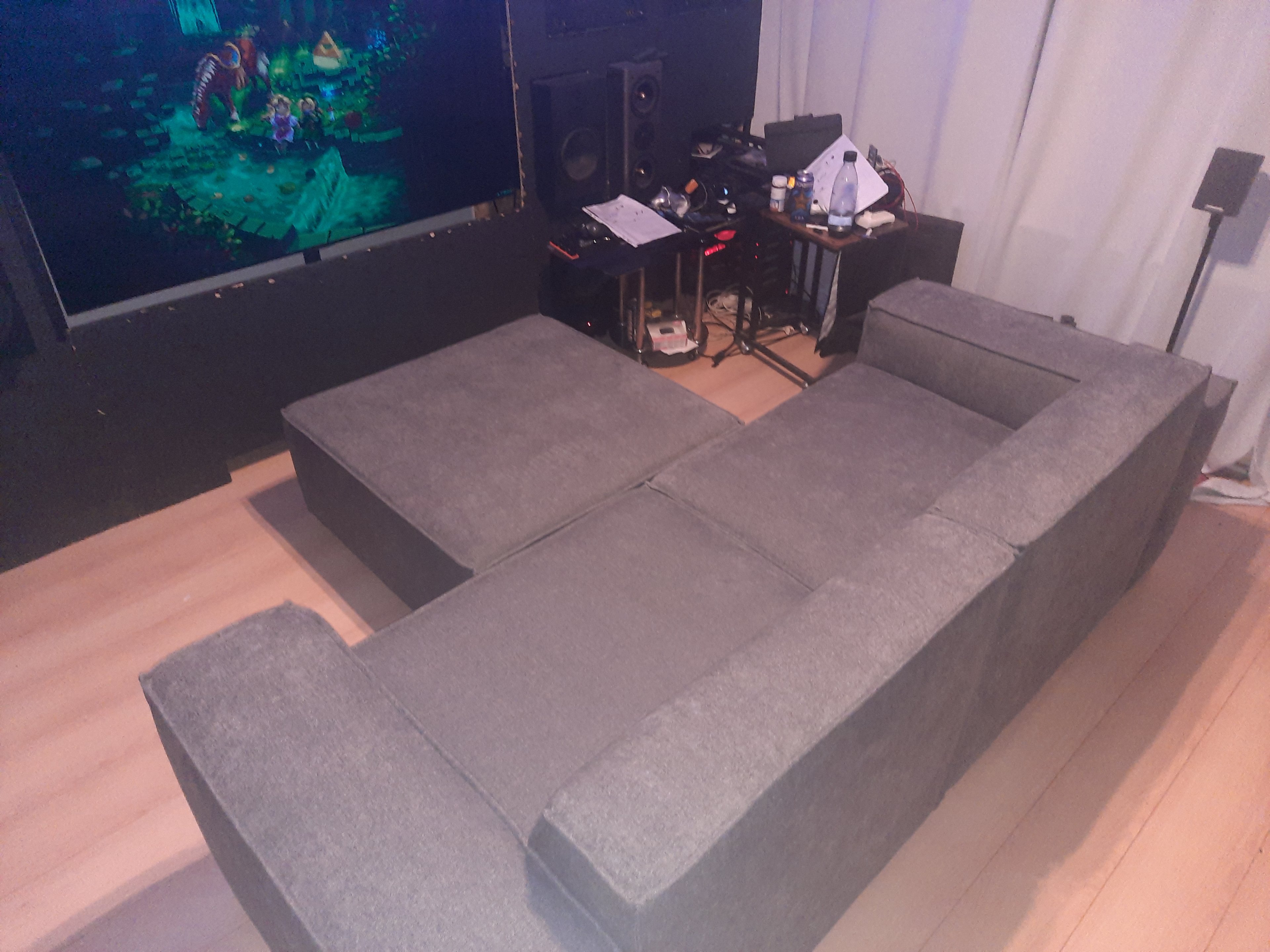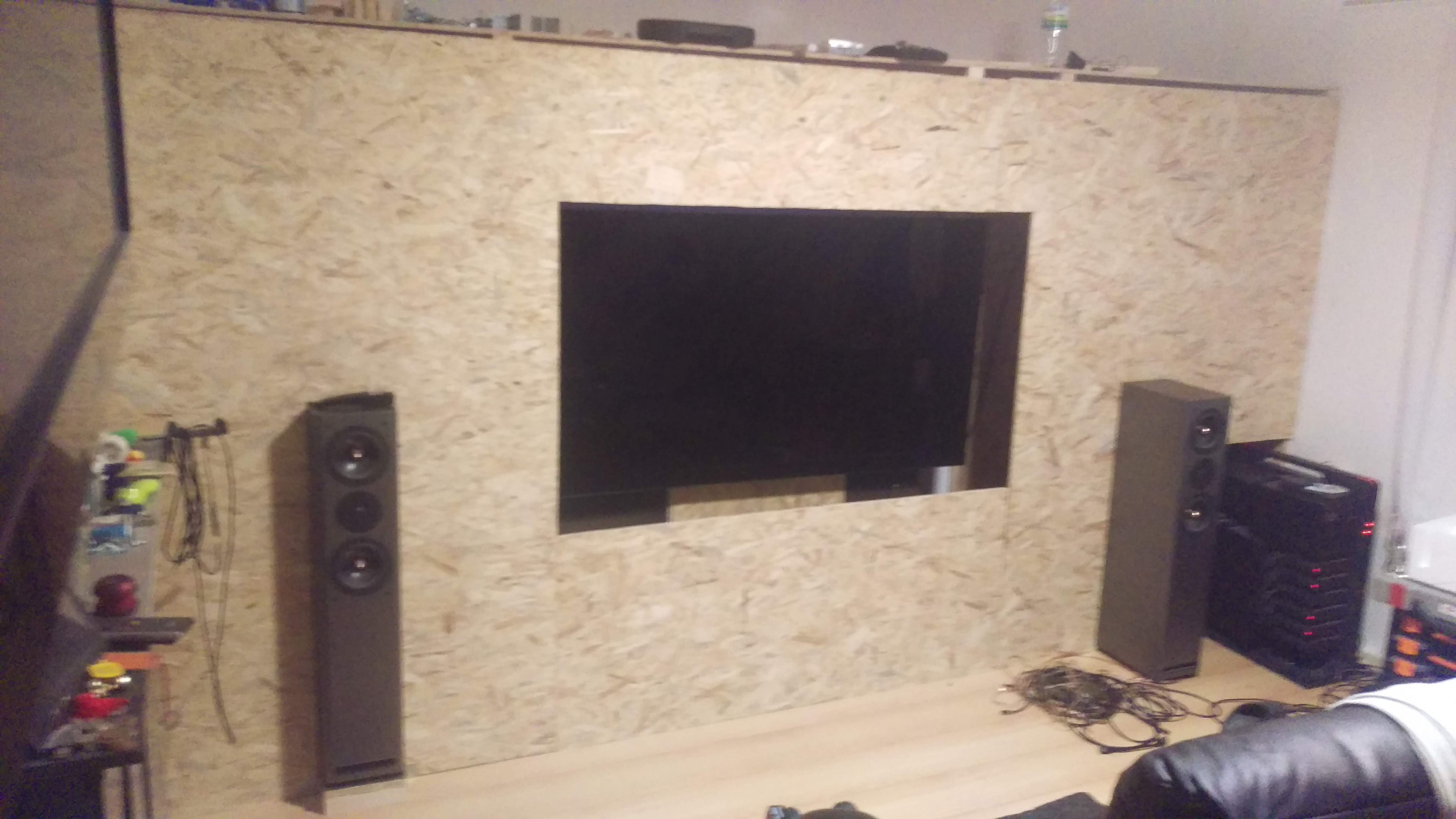 Hier ist noch der alter Fernseher und der Wand selber fehlen noch die Blenden. Glaube ich habe hier grade das neue Sofa aufgebaut, weshalb auch alle Rolltische in der Ecke stehen.
