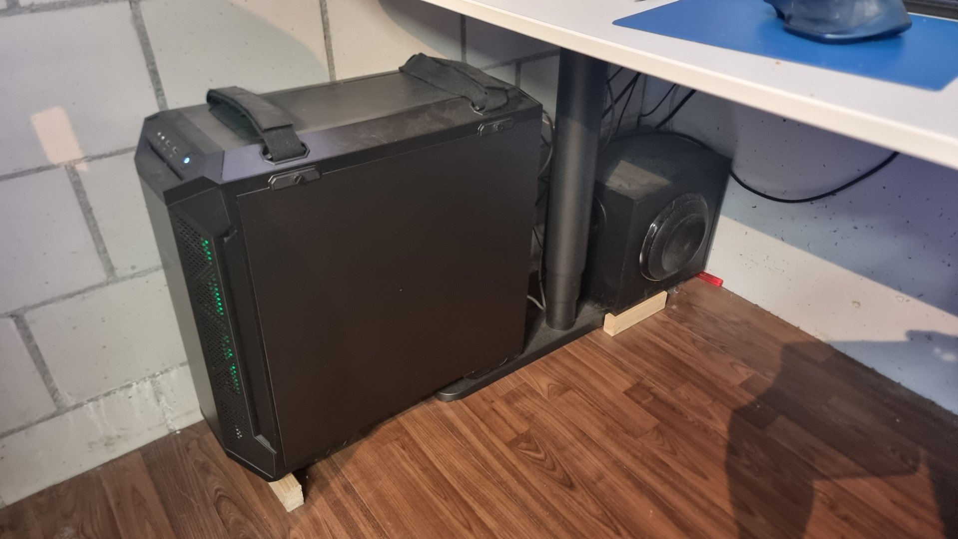 Mein PC steht etwas hinter dem Schreibtisch auf einem Sideboard. Hatte ihn sonst immer unterm Schreibtisch stehen aber iwann kam mir die Idee bei der Raumeinteilung hier, ihn erhöht auf das Sideboard zu stellen, sodass ich ihn über meinem Hauptmonitor hinweg auch sehen kann (RGB Beleuchtung sagt mir dann je nach Farbe wie warm CPU und Gehäuse sind).