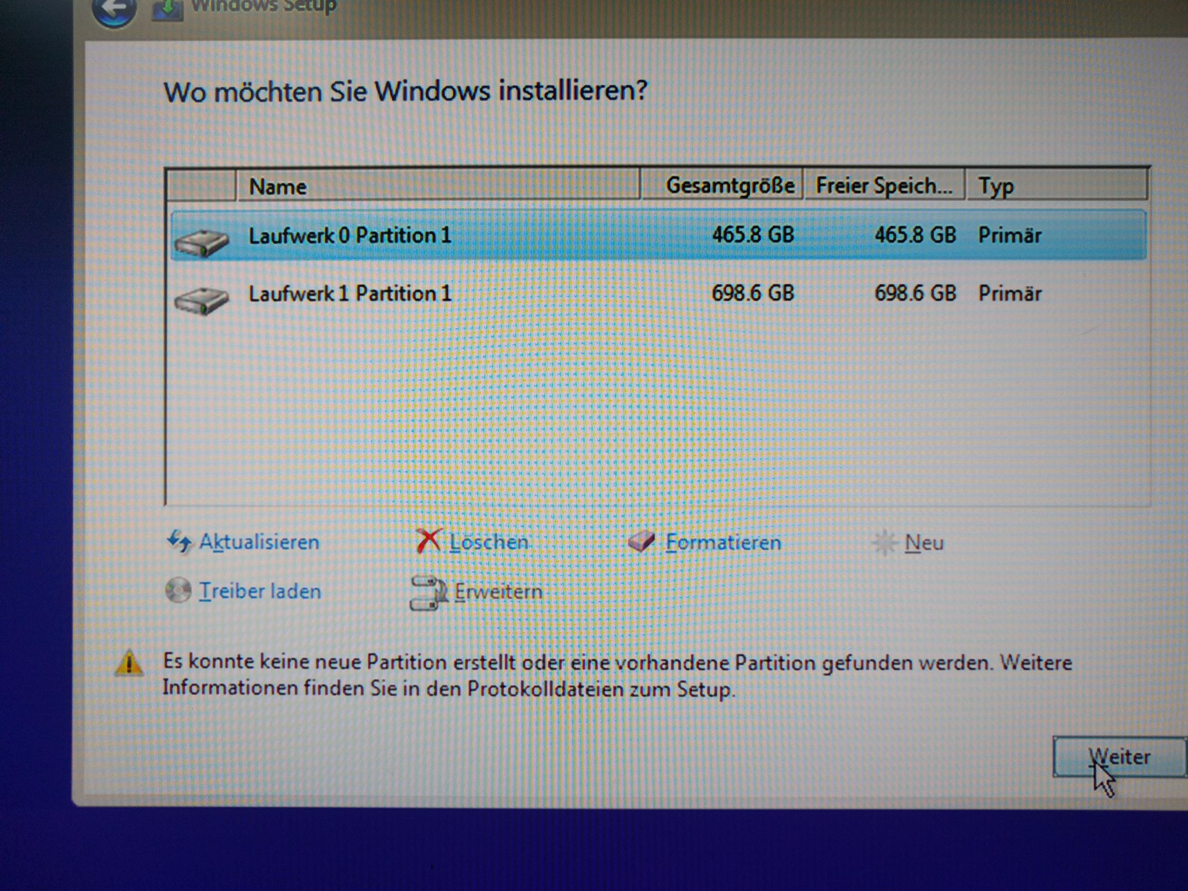 Es konnte keine neue Partition erstellt oder eine neue Partition Gefunden werden