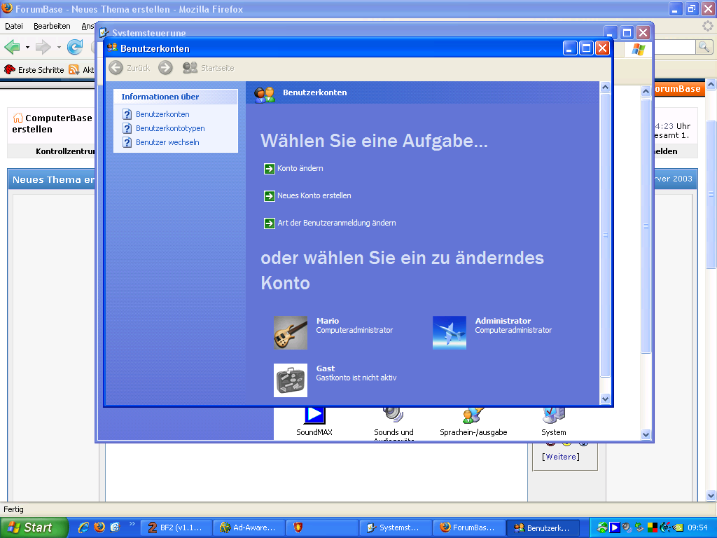 hmm, bis jetzt lief mein System ziemlich stabil, was mir neuerdings aufgefallen ist, dass ich mich jetzt jedesmal bei Win XP mit Beutzer anmelden muss, komisch ohne das ich was verändert habe. Sonst lief Win XP normal hoch. Wenn ich in die Benutzerkonten gehe, seh ich das Bild. Hängt da noch einer als Admin drin oder ist das so normal? Komsich ist, dass ich alles Passwörter neu eingeben musste, im Ebay also auch im Battlefield, was ich vorher auch nicht mußte.