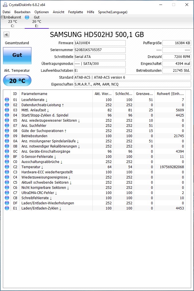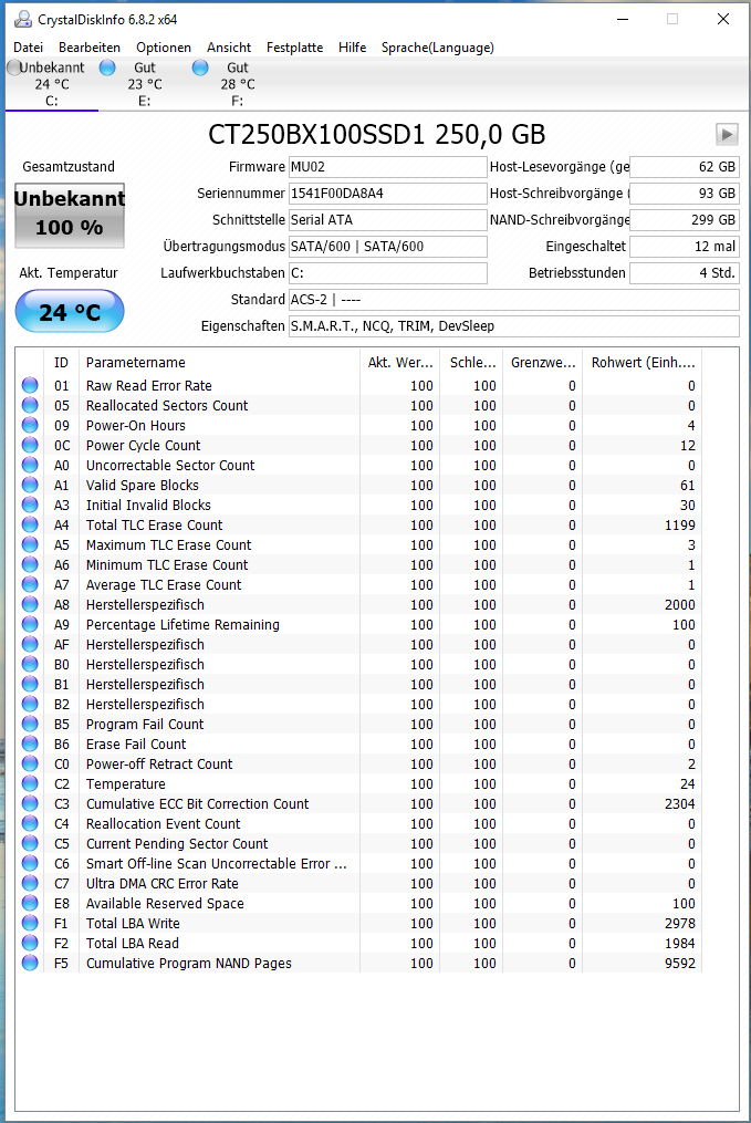 hab mir CrytalDiskInfo runtergeladen da kam dies zu Vorschau, sieht alles ok aus außer, dass der Gesamtzustand Unbekannt ist.