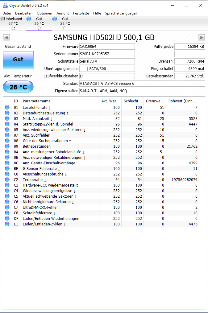 Windows meckert eigentlich nur, wenn ein Aktueller Wert oder ein Schlechtester Wert auf oder unter dem Grenzwert liegen, was hier nicht der Fall ist. Es gibt zwar ein paar Schreib-, Lesefehler, G-Sensor Auslösungen (also zu harte Stöße/Schocks im Betrieb) und auch 2 Ultra-DMA-CRC Fehler, aber die sind weder dramatisch noch sollte Windows davon Notiz nehmen.