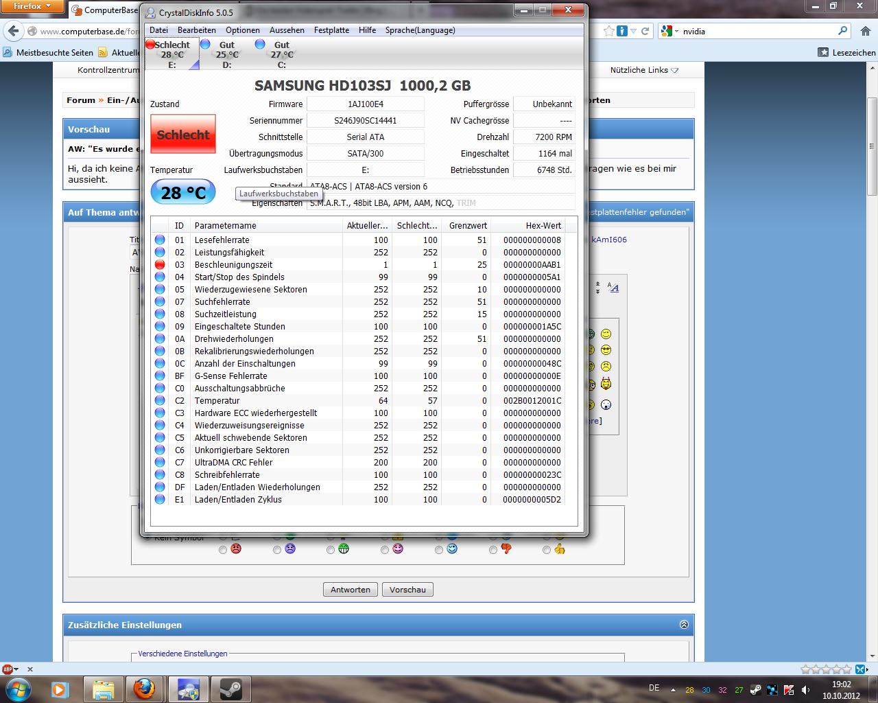 Hast du die Festplatte an einem SATA 6Gb/s Controller angeschlossen? Das Symptom (der Smart-Fehler) und die Firmware Version (1AJ100E4) deutet nämlich auf den Firmware-Bug der F3 Serie hin (betrifft nicht nur den SATA 6Gb/s Controller der AMD SB850 Southbridge).