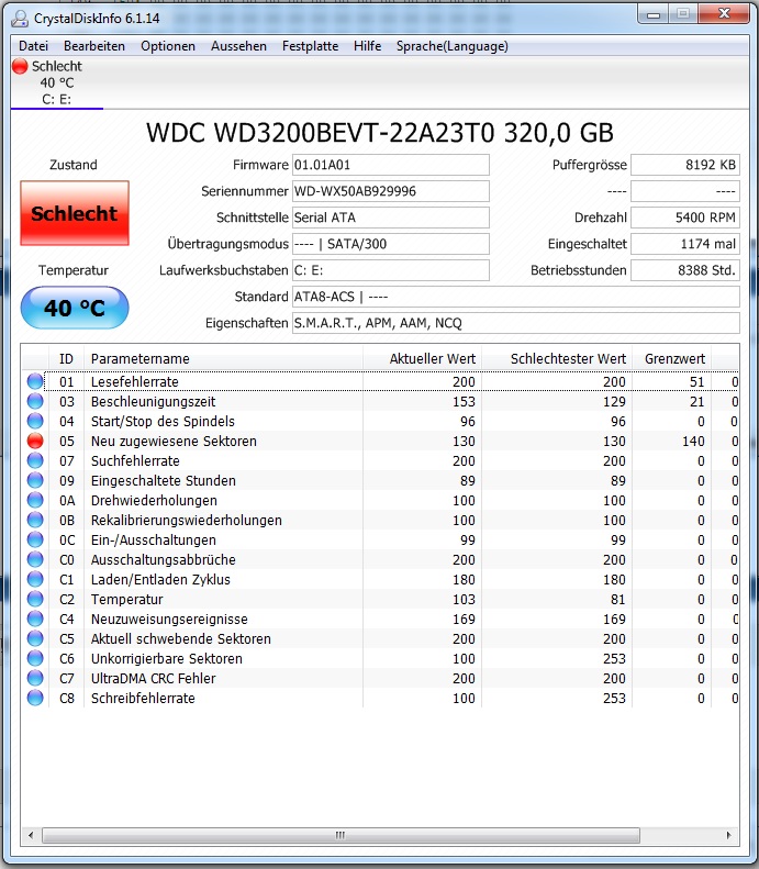Wie Du unschwer erkennen kannst ist das "Schlecht" rot unterlegt bei CrystalDiskInfo.