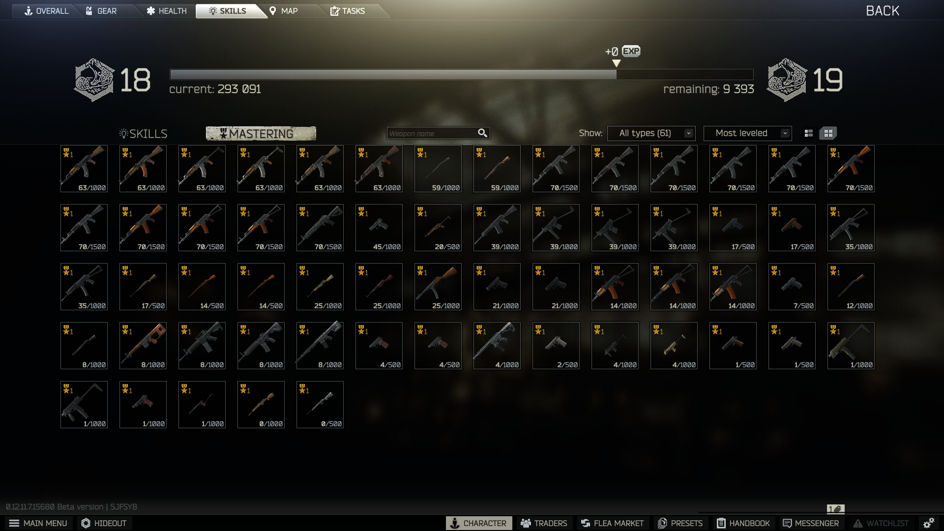 - Für 400+ Stunden hast du viel zu niedrige Händlerlevel. Versuche hier bei den wichtigsten auf Level 4 zu kommen, das macht das Leben leichter. Brauchbare Munition wie 762x39 BP oder M855A1 sind hinter Quests gelocked.