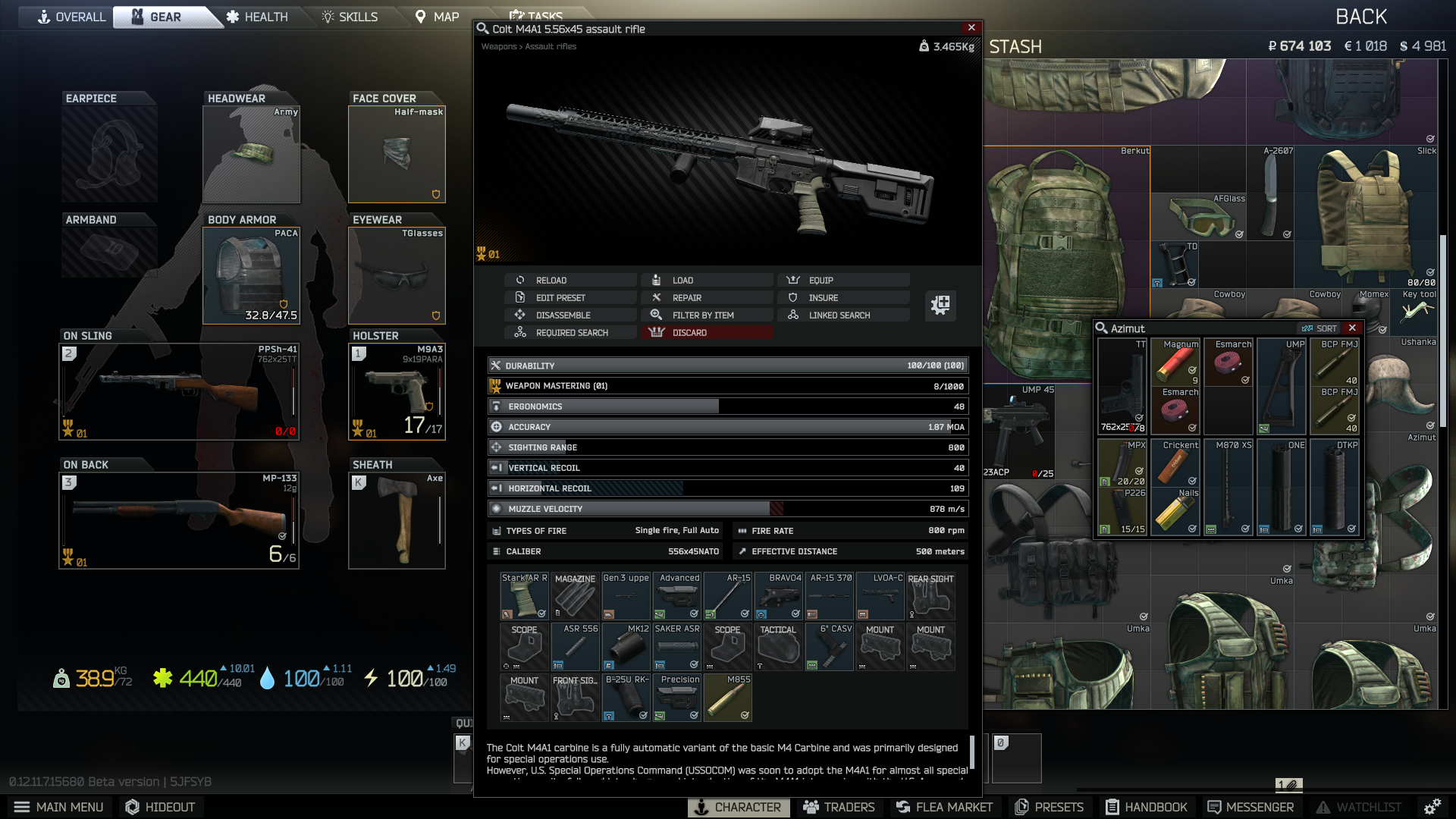 Ich mach das eigentlich genau so wie Du @maloz mit dem Modding von Waffen. Manche modde ich sogar gar nicht und spiel sie out of the Box. Wenn man damit umzugehen weiß, braucht man nicht zwingend ne Recoil Reduktion. Mit der M4 auf Fullauto, ist man aber besser beraten mit wenig Recoil. Allerdings ist die M4 auch eher was für mid/late Wipe, weil einfach alles super teuer an dem Ding ist. Und 5.56 ist zwar ne sehr schnelle Munni, macht aber im Verhältnis zu 7.62 weniger Schaden.