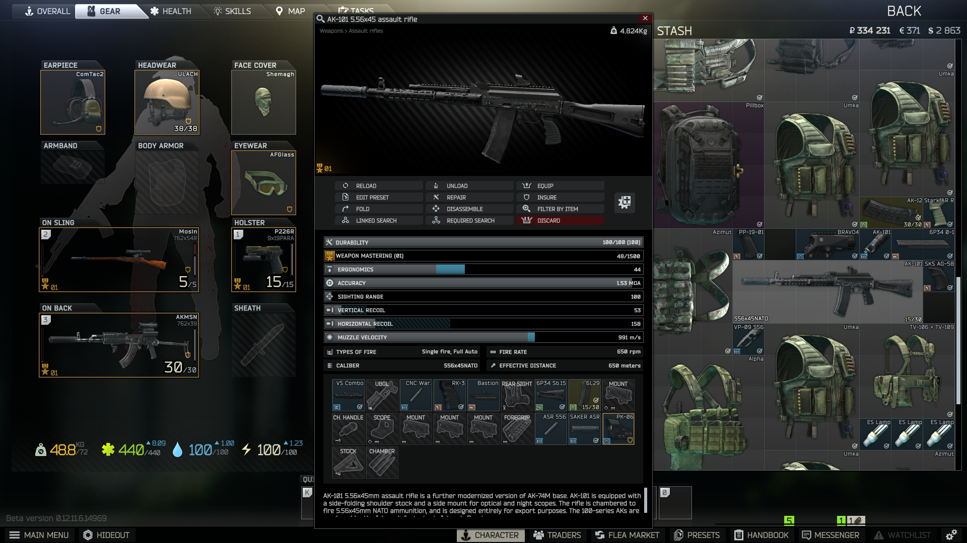 Gestern dann ohne jeglichen Zwang und Plan, einfach mal 2.5h gemütlich gezockt und 2 richtig gute PMC Runden gehabt, 3 Quests auf einmal erledigt, auf Woods 2 Spieler und 6 Scavs rasiert und bäm, direkt Level 6. Was ich hauptsächlich damit sagen will: Lasst es mal ruhig angehen, dann kommt alles von allein. Auf Woods hatte ich nur ne VEPR 209 dabei, also .366er und nicht mal die HP oder AP Munni, sondern nur die FMJ, ging wie Butter, das ist das Schöne am early Wipe. Ich mach das sowieso generell immer so, dass ich am Anfang alles an mid bis high tier gear verkaufe und nur mit Zeug spiele was ich finde oder aus Scavruns raushole, das erspart viel Frust. Dieses Mal spiele ich USEC und hab tatsächlich die MDR, die M700, beide M4, den night vision Kram, die Crye AVS und noch so einiges andere direkt verkauft.