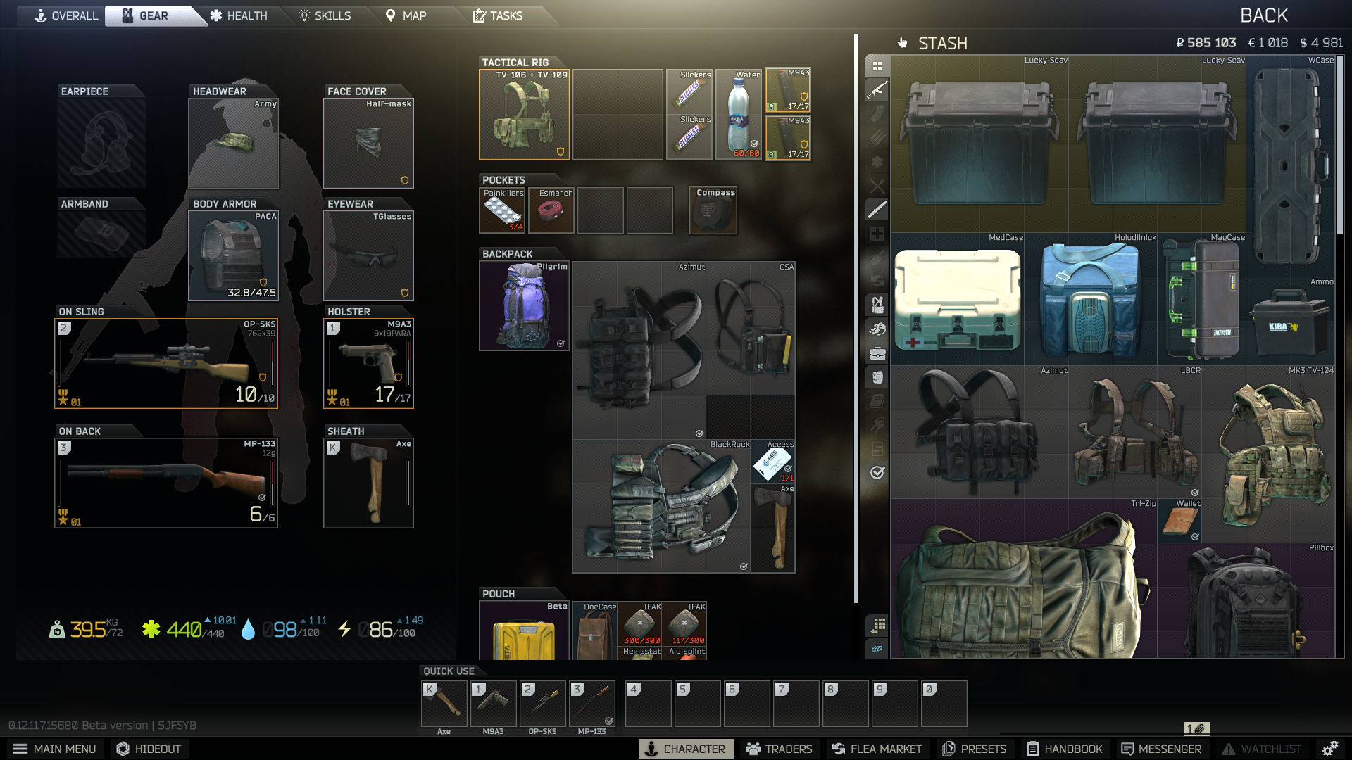 Vor einer Scav-Runde die grösste Rig und den grössten Rucksack, mitsamt voller Ausstattung beim PMC angelegt und so im Stash für den loot des Scav Platz geschaft. Wäre ja sonst kein Platz vorhanden!