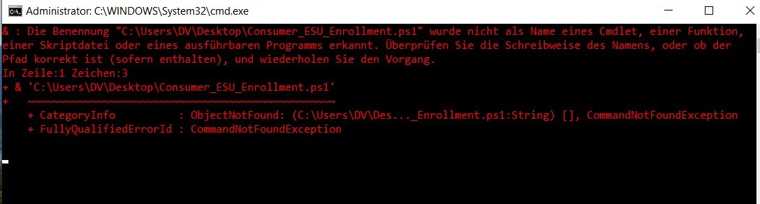Falls wieder eine Fehlermeldung auftaucht, kopiere das Verzeichnis "ConsumerESU" direkt in den Root deiner Festplatte C: oder D: oder was immer und führe "Consumer_ESU_Enrollment_run.cmd" nochmals als Administrator aus.