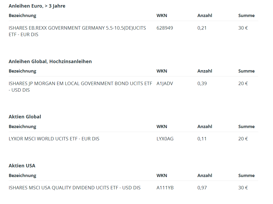 Für den Sparplan würde ich einfach mal anfangen. Staatsanleihen als Asset kann dann Sinn machen, wenn man rollierend in bspw. 5 Tranchen in 5jr Bundesbriefe anlegt. bspw pro Jahr 2k Euro über 5 Jahre. Ab dann wird jedes Jahr eine Tranche a 2k frei, die wieder investiert wird. Dient aber wirklich nur der maximalen Absicherung und nicht der Rendite.