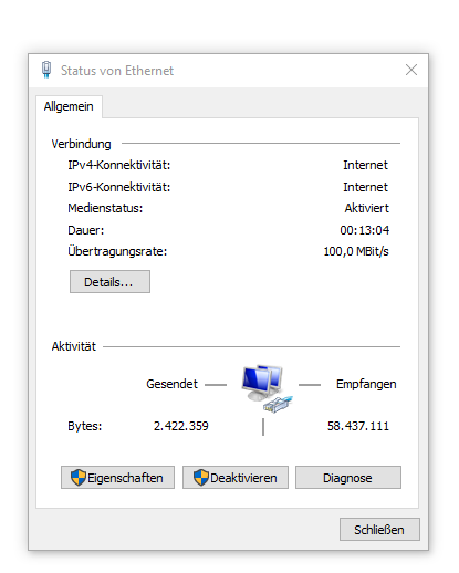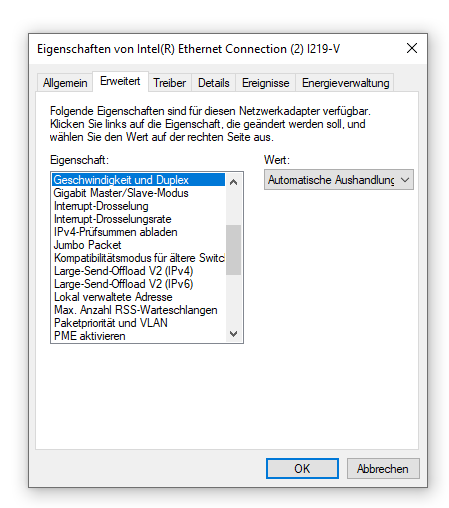 Leider wird in den Einstellungen angezeigt das der PC nur mit 100mbit/s verbunden ist, siehe Bild.