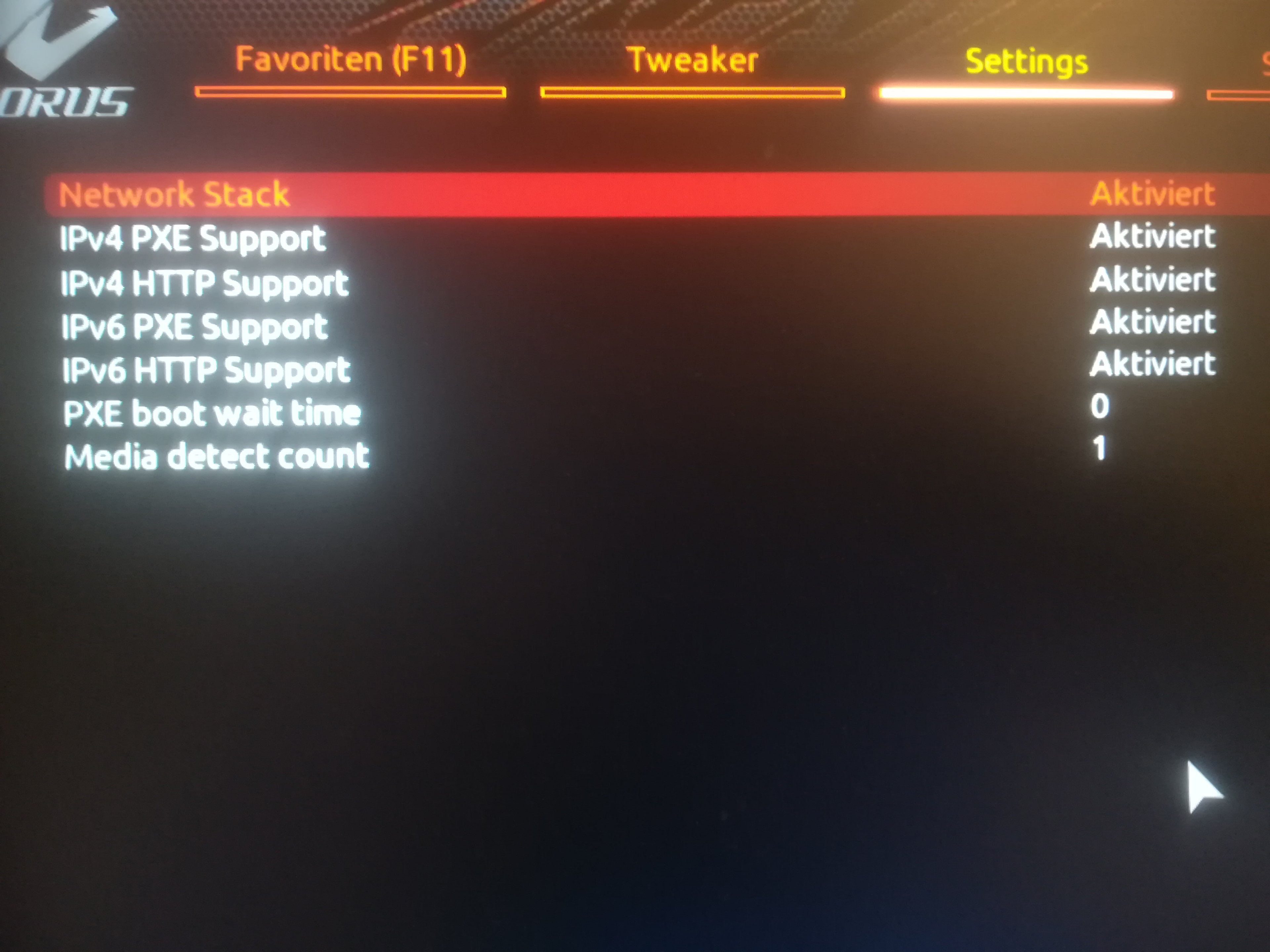 Schau bitte im BIOS mal nach was sich hinter Network Stack Configuration (aus Deinem Screenshot) verbirgt, nicht das hier was verdreht ist. Handbuch sollte helfen bei dem was ist/war/sein soll darin.