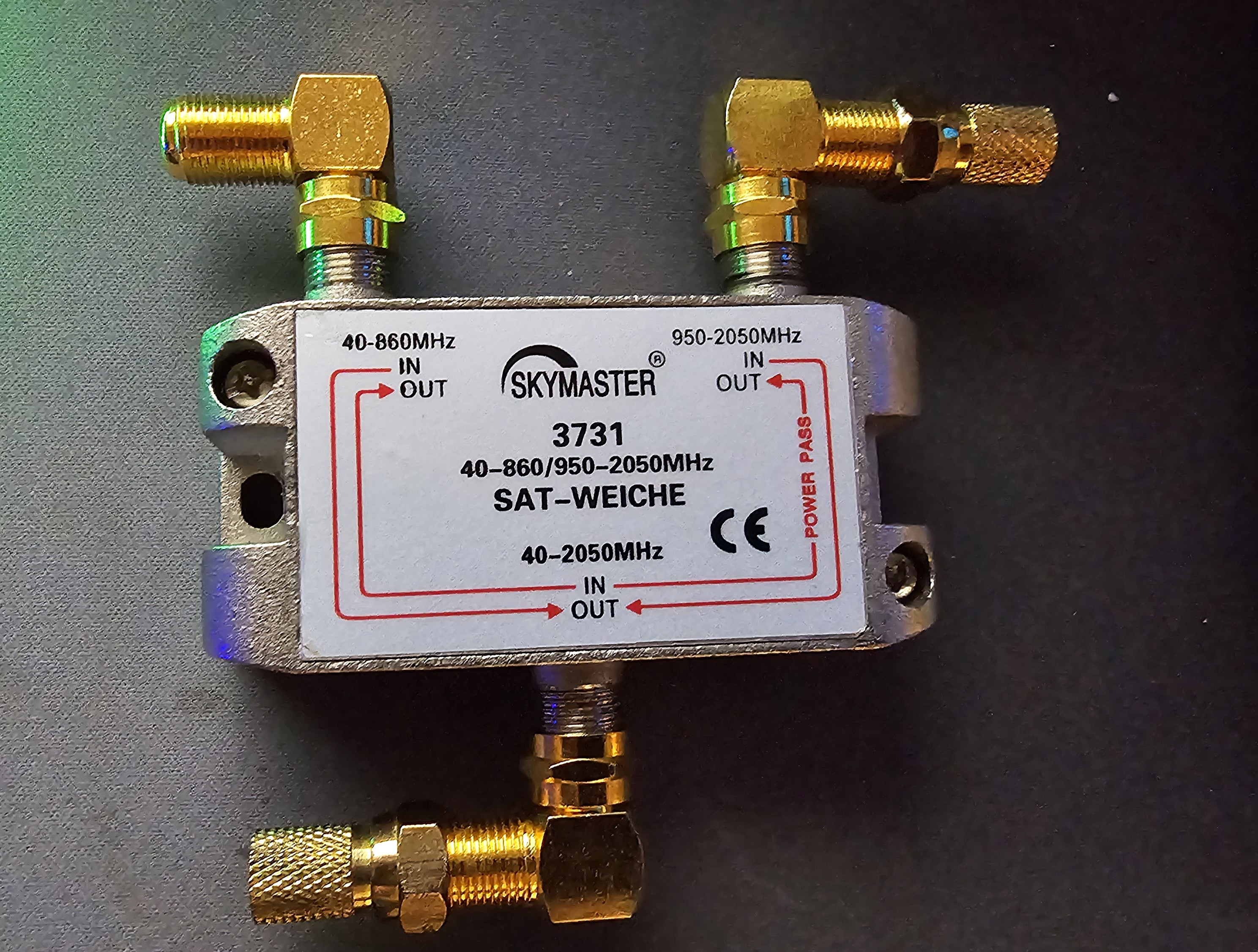 Der Satellitensignal arbeitet im Frequenzbereich von 950 – 2150 MHz und daher habe ich mich für ein Gerät entschieden, was im niedrigen Bereich arbeitet. Dann können beide Signale auf einem Kabel eingespeist und auch wieder voneinander getrennt werden.