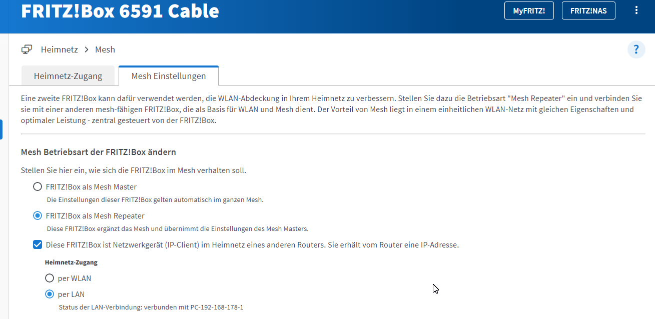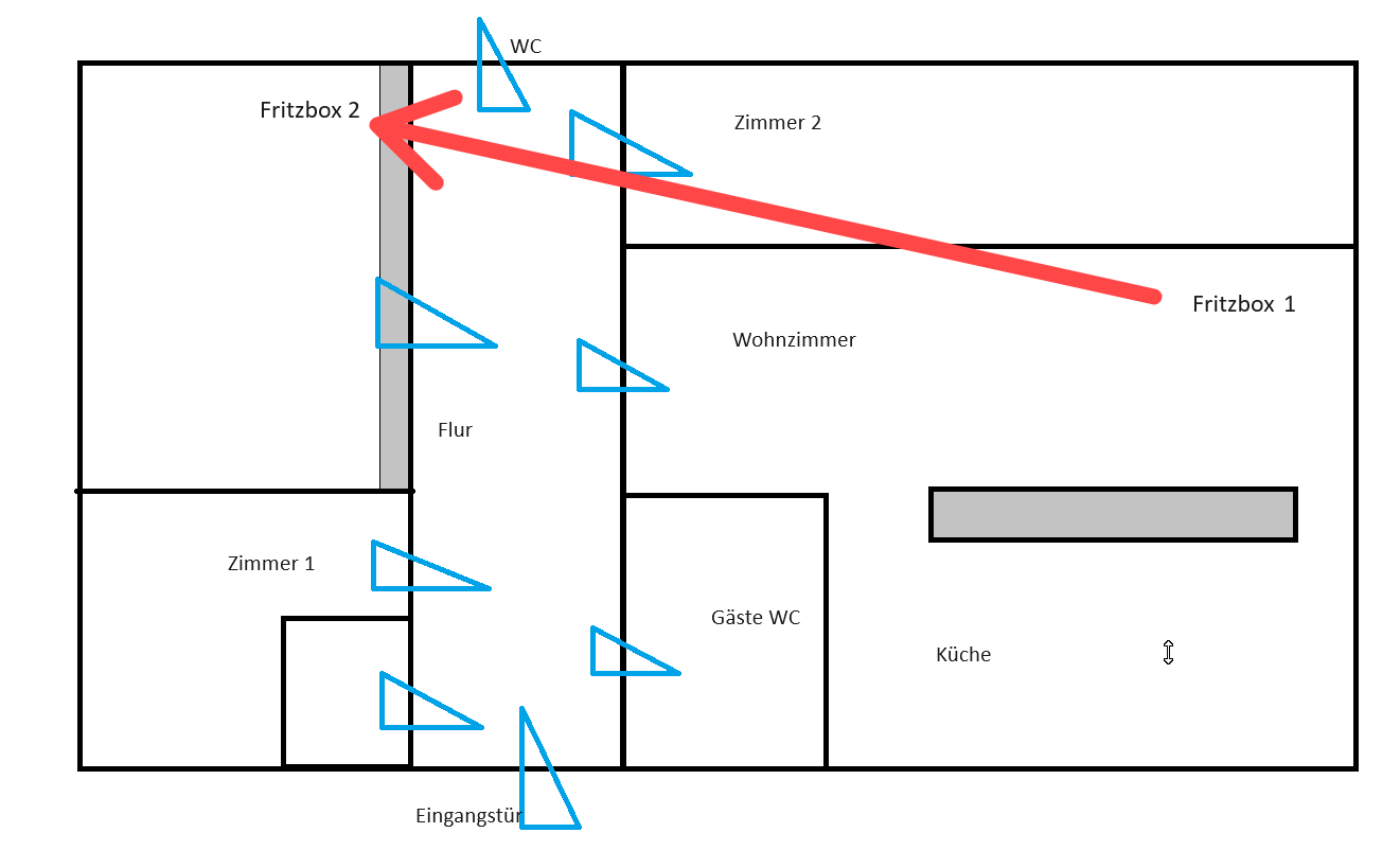 Momentan habe ich eine Fritz!Box 6690 im Wohnzimmer stehen und eine Fritz!Box 6591 als Repeater/Accesspoint umgestellt im Schlafzimmer stehen. Bisher habe ich eine W-LAN Brücke genutzt und fürs Internet reicht sie vollkommen aus. Im Schlafzimmer habe ich einen zweiten Arbeitsplatz und hierzu habe ich einen Laptop inkl. Monitor dort stehen.