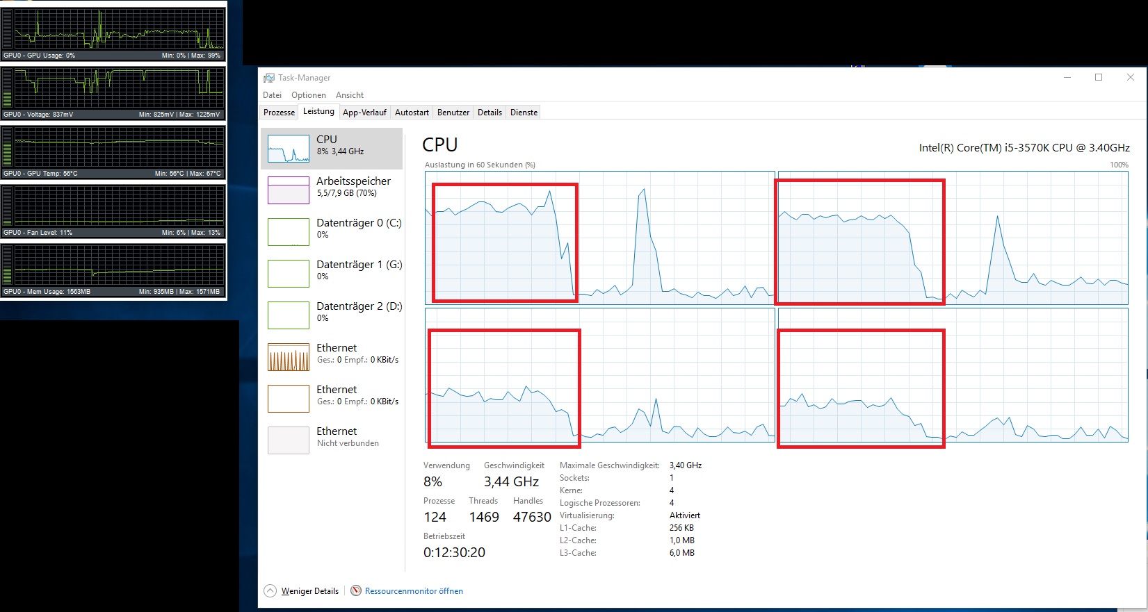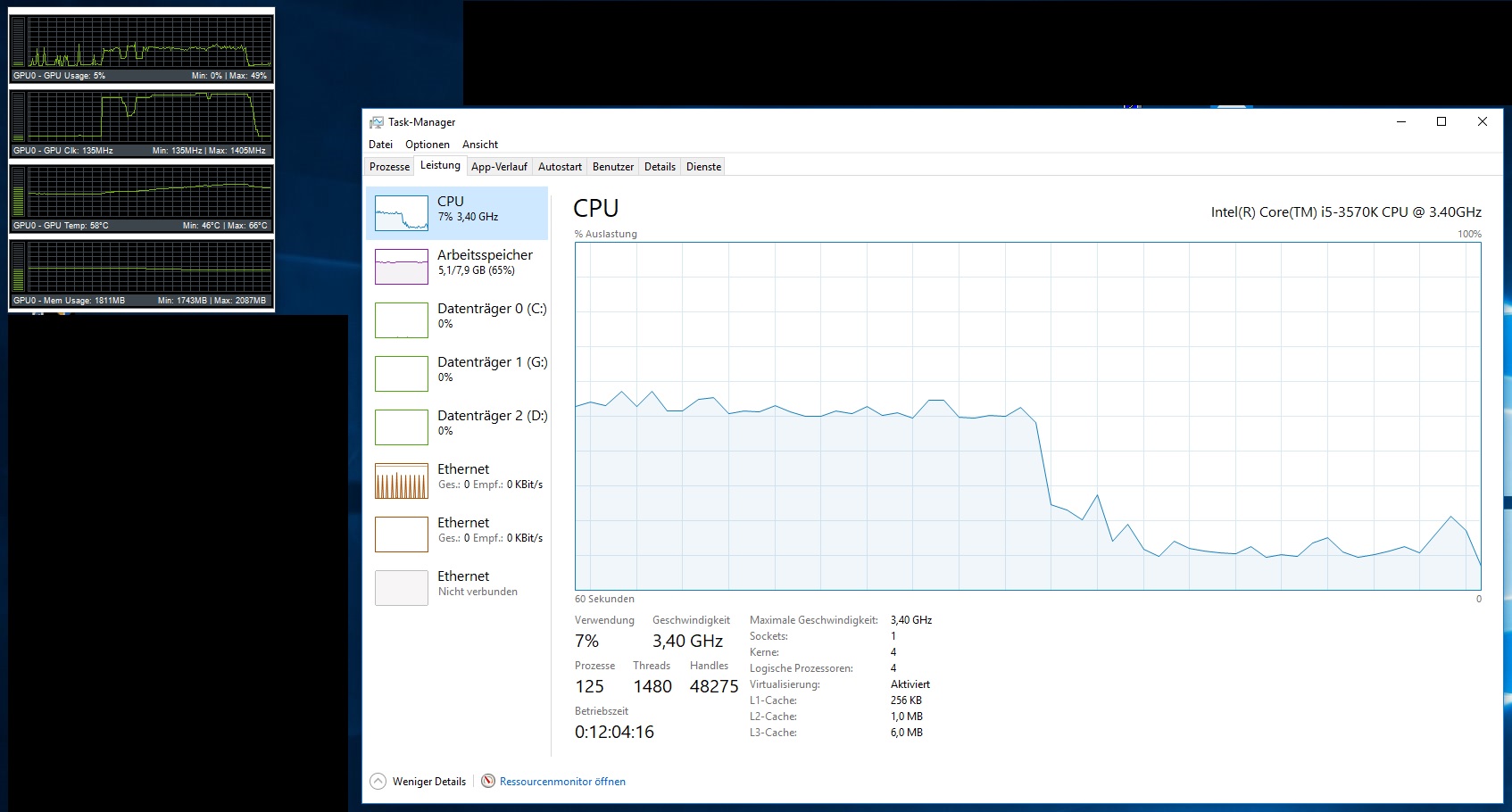 Während einem dieser Einbrüche habe ich mal den Taskmanager sowie nVidia Inspector mitlaufen lassen, Ergebnis siehe Anhang. Die CPU pendelt zwischen 50 und 60%, die GPU bei max. 49%, VRAM nichtmal halbvoll und im RAM sind auch noch 2GB frei. Auf die SSD wird quasi garnicht zugegriffen.