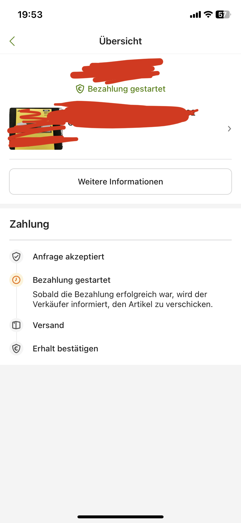Hey, kleine Frage: Ich habe diesen Montag (so gegen 22 Uhr) etwas über Kleinanzeigen gekauft und direkt über die Plattform auch bezahlt mit Klarna. Das Geld wurde auch abgehoben sofort aber dennoch steht bis heute bei mir das die Zahlung in Bearbeitung ist und wenn ich darauf klicke steht: "Bezahlung gestartet. Sobald die Bezahlung erfolgreich war, wird der Verkäufer informiert, den Artikel zu verschicken.".