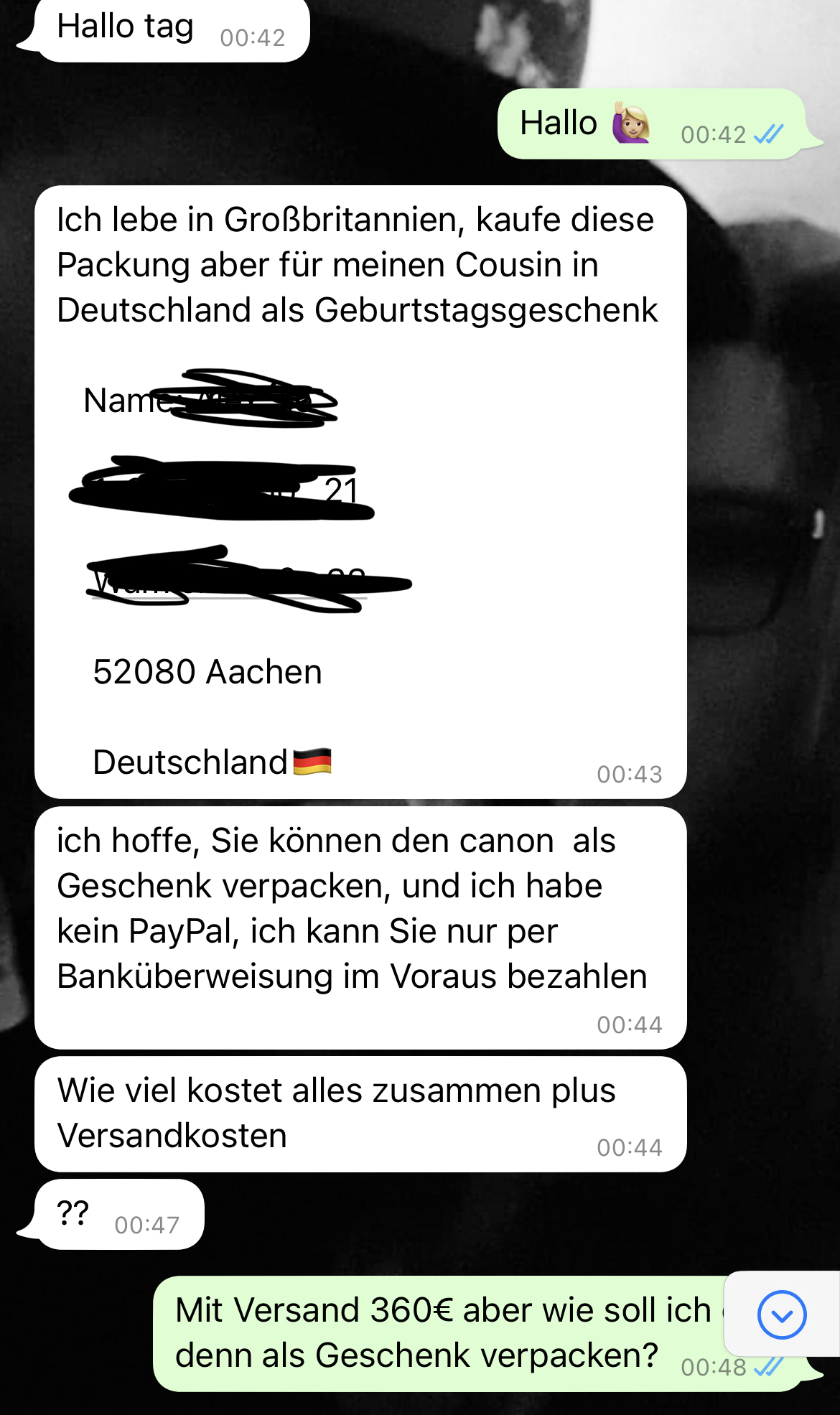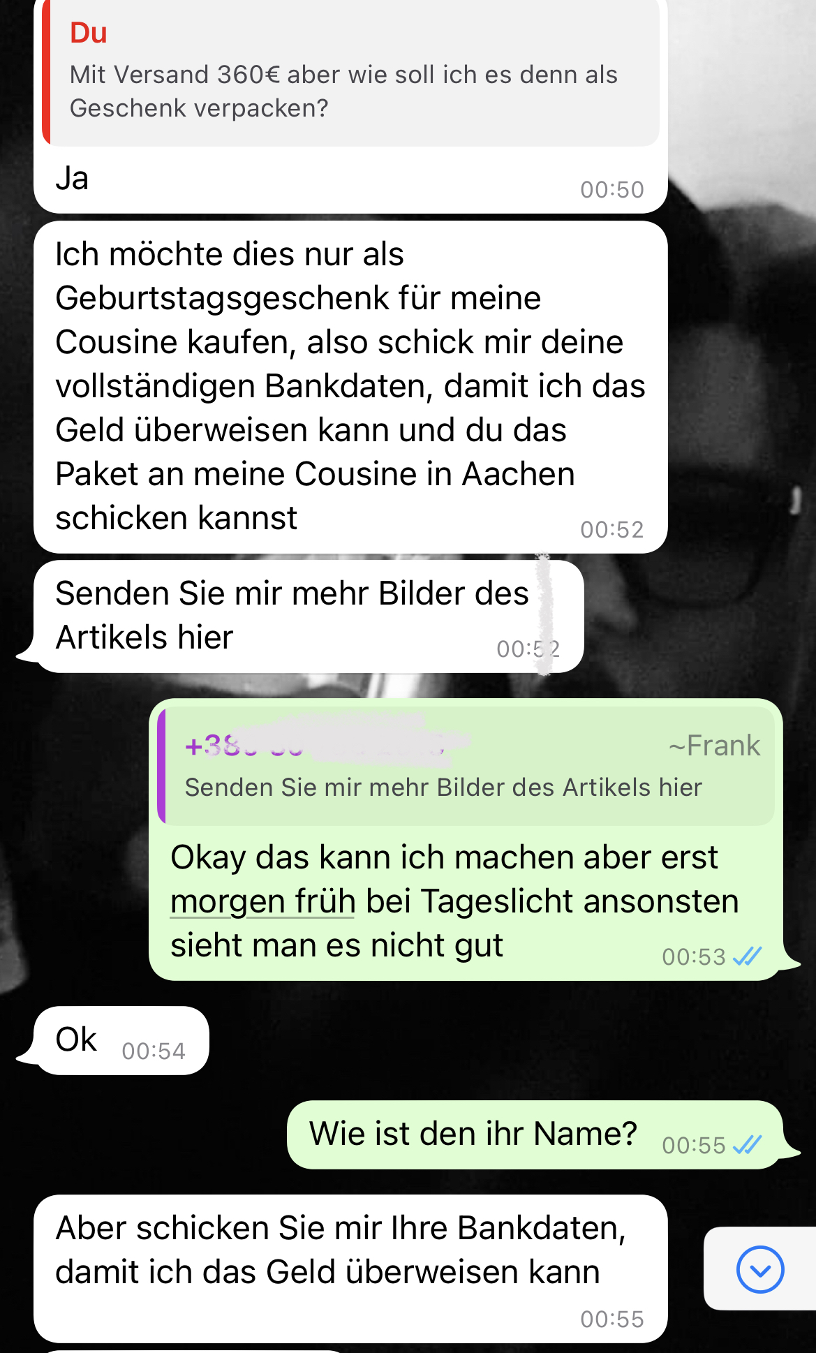 Hallo, nein ich habe es natürlich nicht gemacht anbei mal ein paar Screenshots vom Chat Verlauf, habe ihn versucht hinzuhalten er war sich anscheinend nicht sicher ob er eine Cousine oder einen cousin hat 🤦🏼♀️ Habe ihn jetzt blockiert und auf EBay gemeldet.supertux22 schrieb:Sag dass du das nicht machst oder ignoriere ihn einfach, Kontodaten hast du ihm hoffentlich noch nicht geschickt?