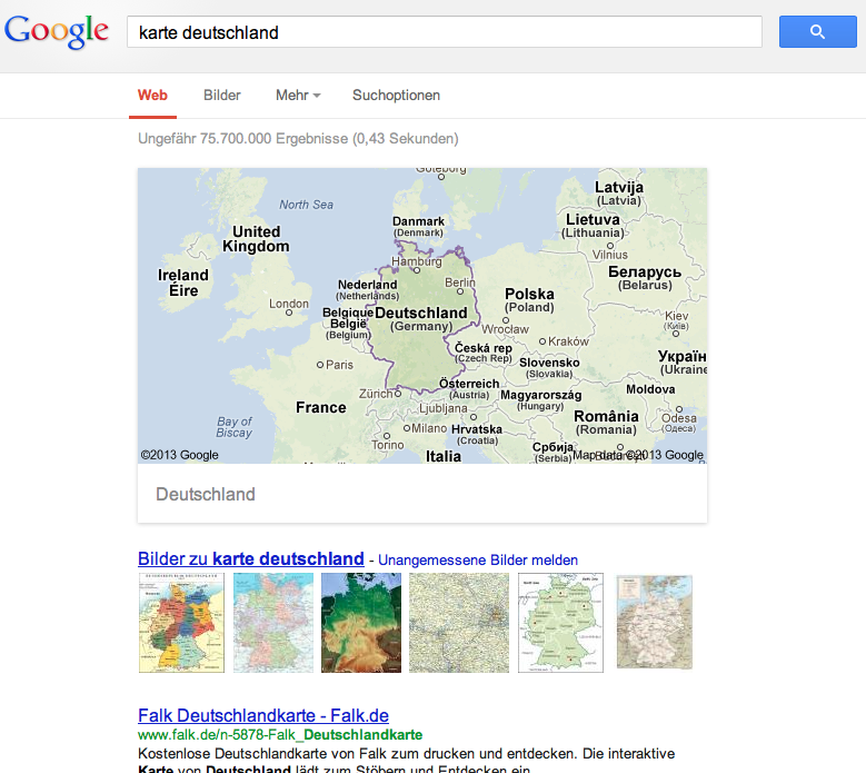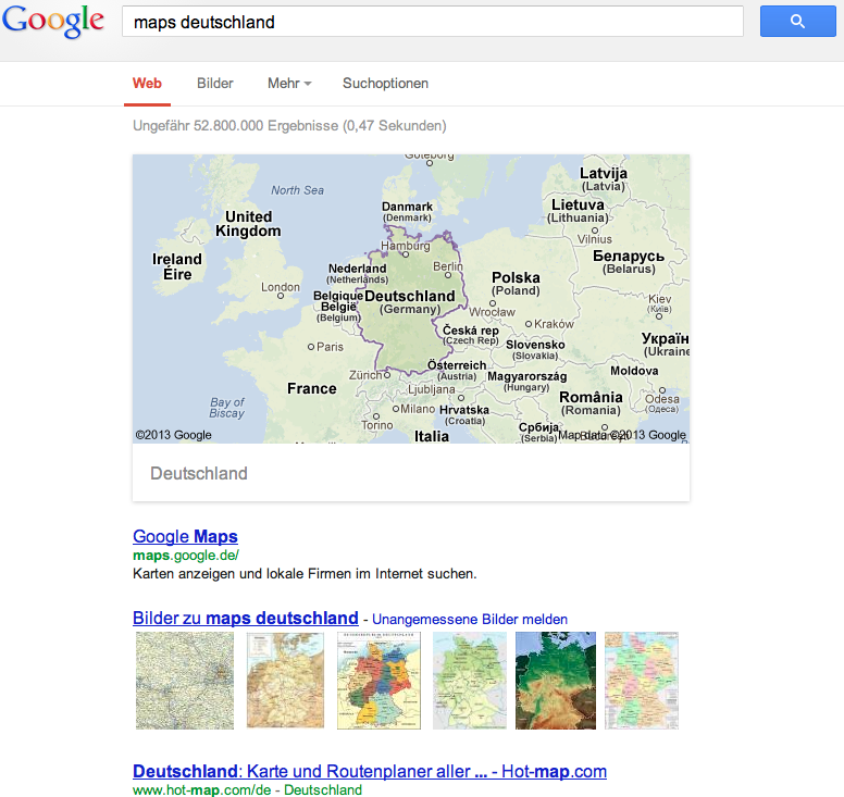 Das nächste Beispiel ist meiner Meinung nach dann nicht mehr okay. Hier wird Google Maps als Sucheintrag klar herausgehoben in dem es zwischen die eigentliche Kartenanbindung und die Bildersuche plaziert wird. Wenn Google Maps am meisten gesucht wird gehört es auch auf Platz 1, jedoch unter die Bildersuche zu den anderen Suchergebnissen.