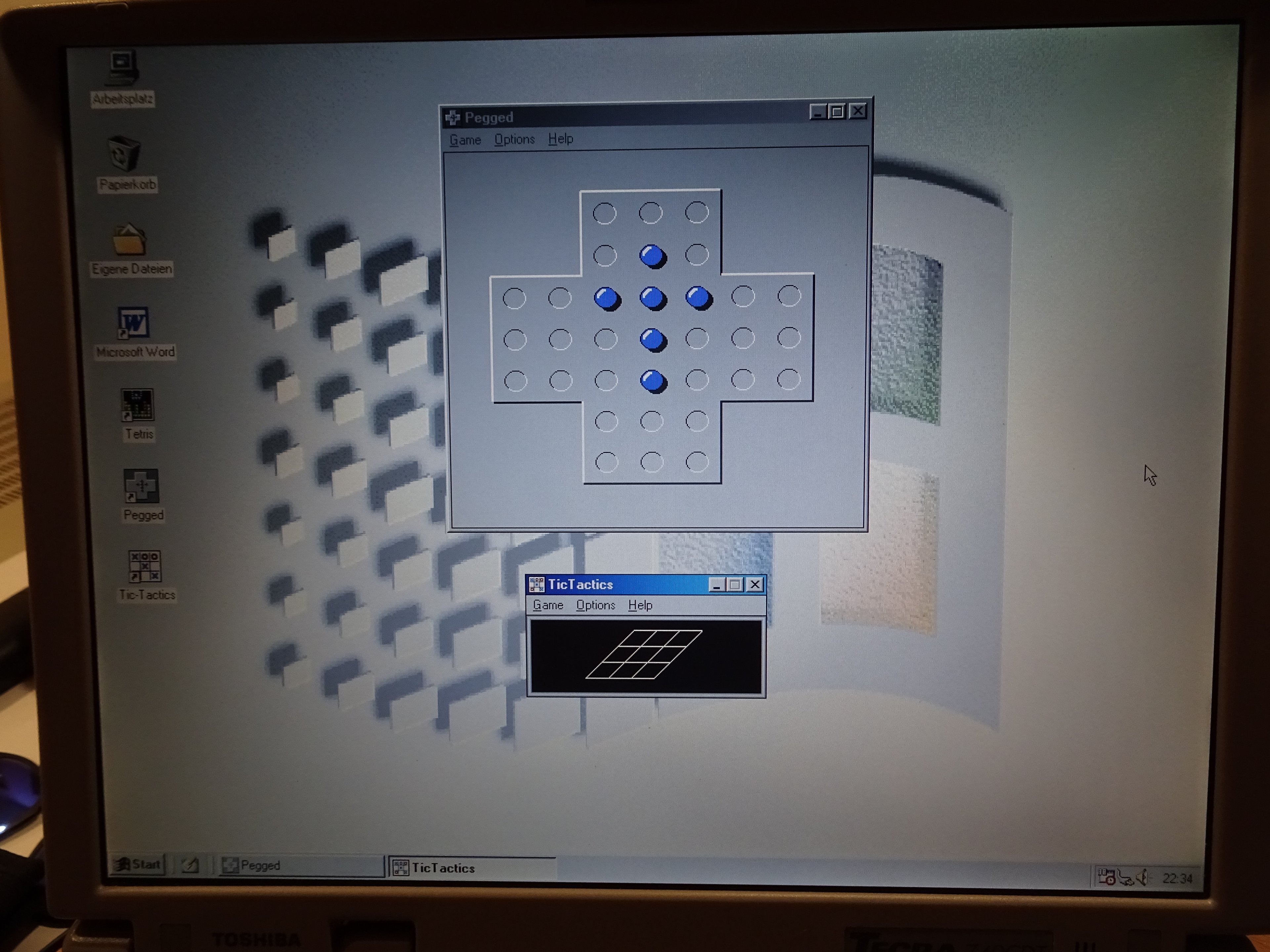 Und dann, das 'Windows Entertainment Pack' (in DE: 'Microsoft Spaß und Spiele für Windows') installiert, dessen Spiele ich früher immer bei meinem Onkel auf seinem Arbeits-PC, einem ESCOM mit Windows 3.11, spielen durfte: TETRIS, PEGGED und TicTactics. Die Diskette hat er mir vor Jahren geschenkt, habe ich immer noch, davon war die Installation aber nicht möglich. Nach dem Zerlegen des externen Tohsiba Floppys wurde klar, wieso - der Gummiriemen des Laufwerks lag in hunderten Sückchen im Gehäuse herum... Floppys habe ich zwar noch viele, aber kein Board mit IDE mehr. Die Spiele vor ein paar Jahren von der Diskette auf einen Rohling zu sichern hat sich daher als gute Idee erweisen.