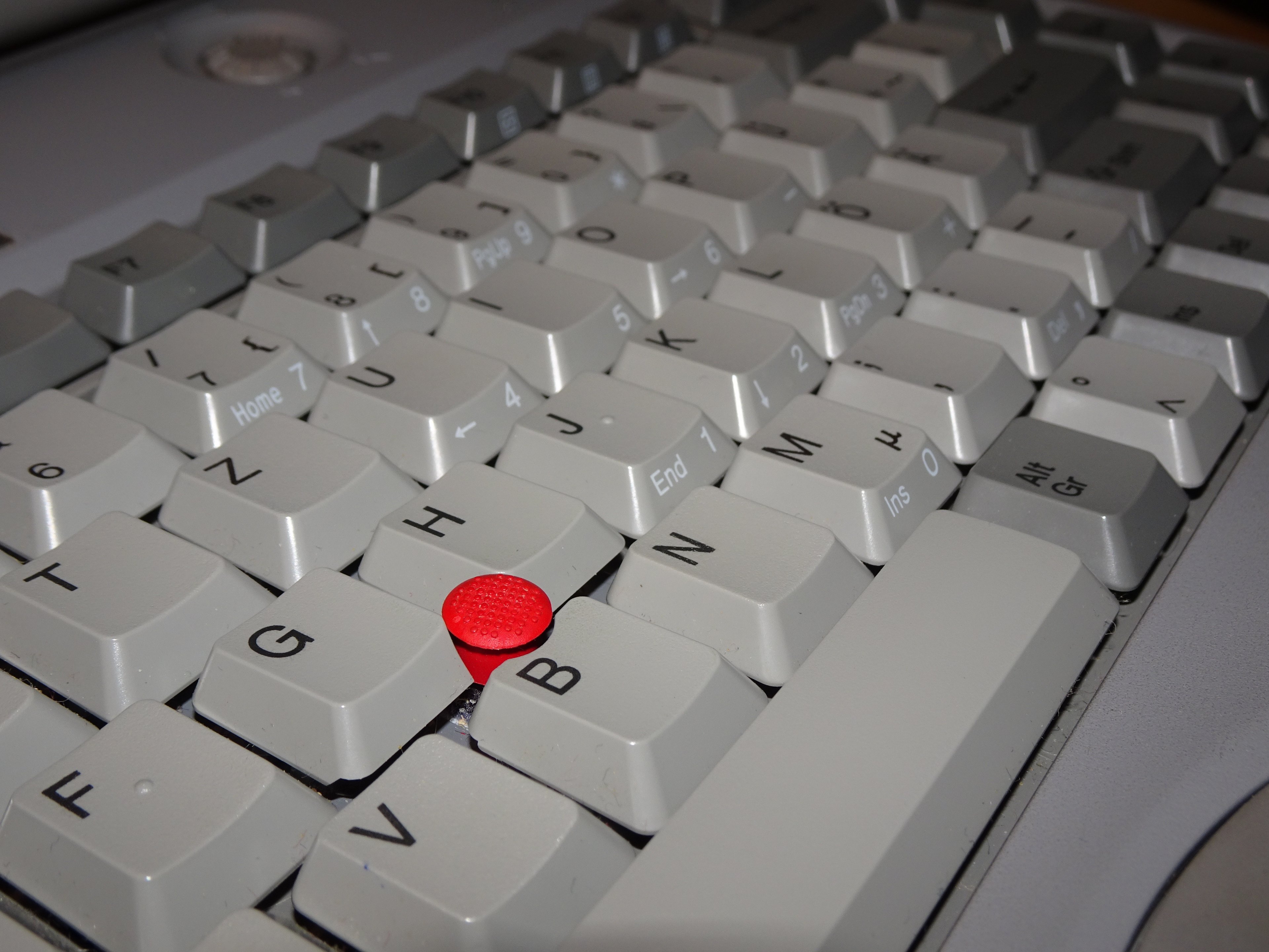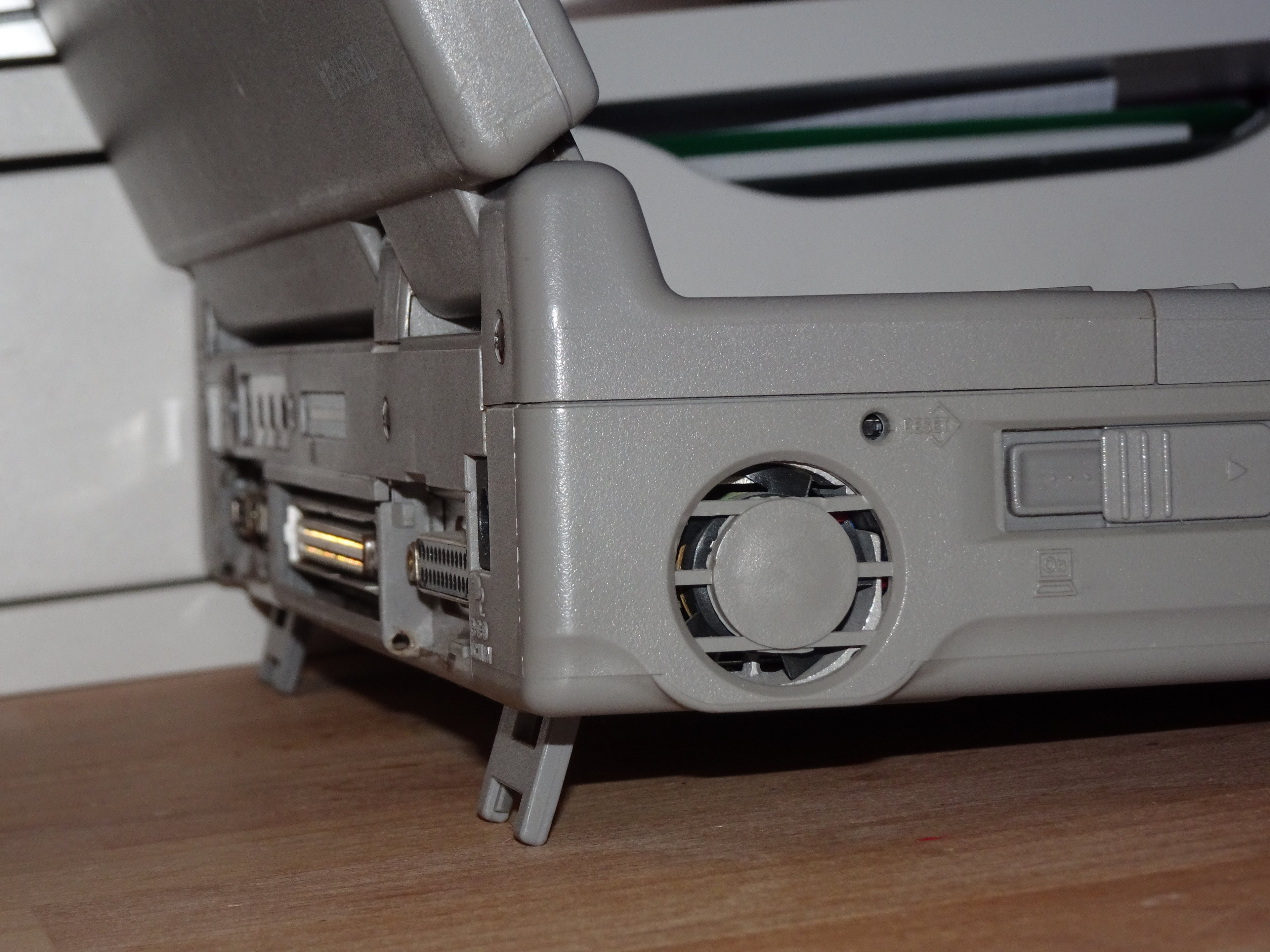 Interessant, welche Dimensionen die Teile vor 20 Jahren hatten. Alles wieder eingebaut und los. Es dauert 5 Minuten, da lösen sich die halb verwesten Reste der grünen Gummikappe vom Pointingstick endgültig ab. Das blanke Plastikstift ist brutal spitz und sticht in den Finger, aber die rote Kappe, die eigentlich auf ein ThinkPad gehört, passt prima zu der für einen Laptop außergewöhnlich guten Tastatur. Klappt man dann noch die Hochstellfüße aus, lässt sich richtig bequem tippen: