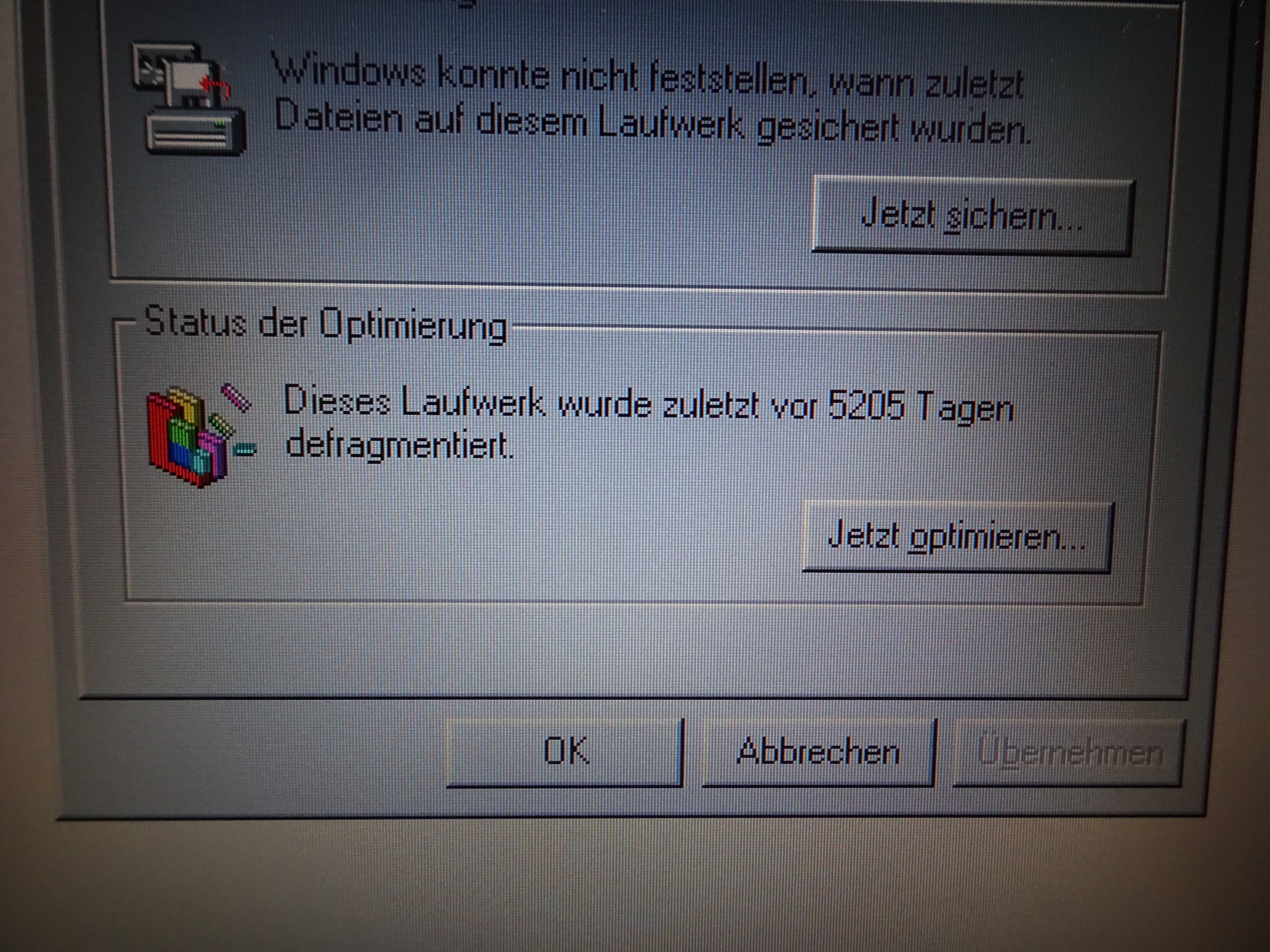 Zwar sind CDs von Windows 95, 98, ME und 2000 bei mir vorhanden, die Windows 98-Installation des Vorbesitzers läuft aber noch sehr gut - und das, obwohl die letzte Defragmentierung vor 5205 Tagen, wohl also irgendwann im November 2004, durchgeführt wurde ...
