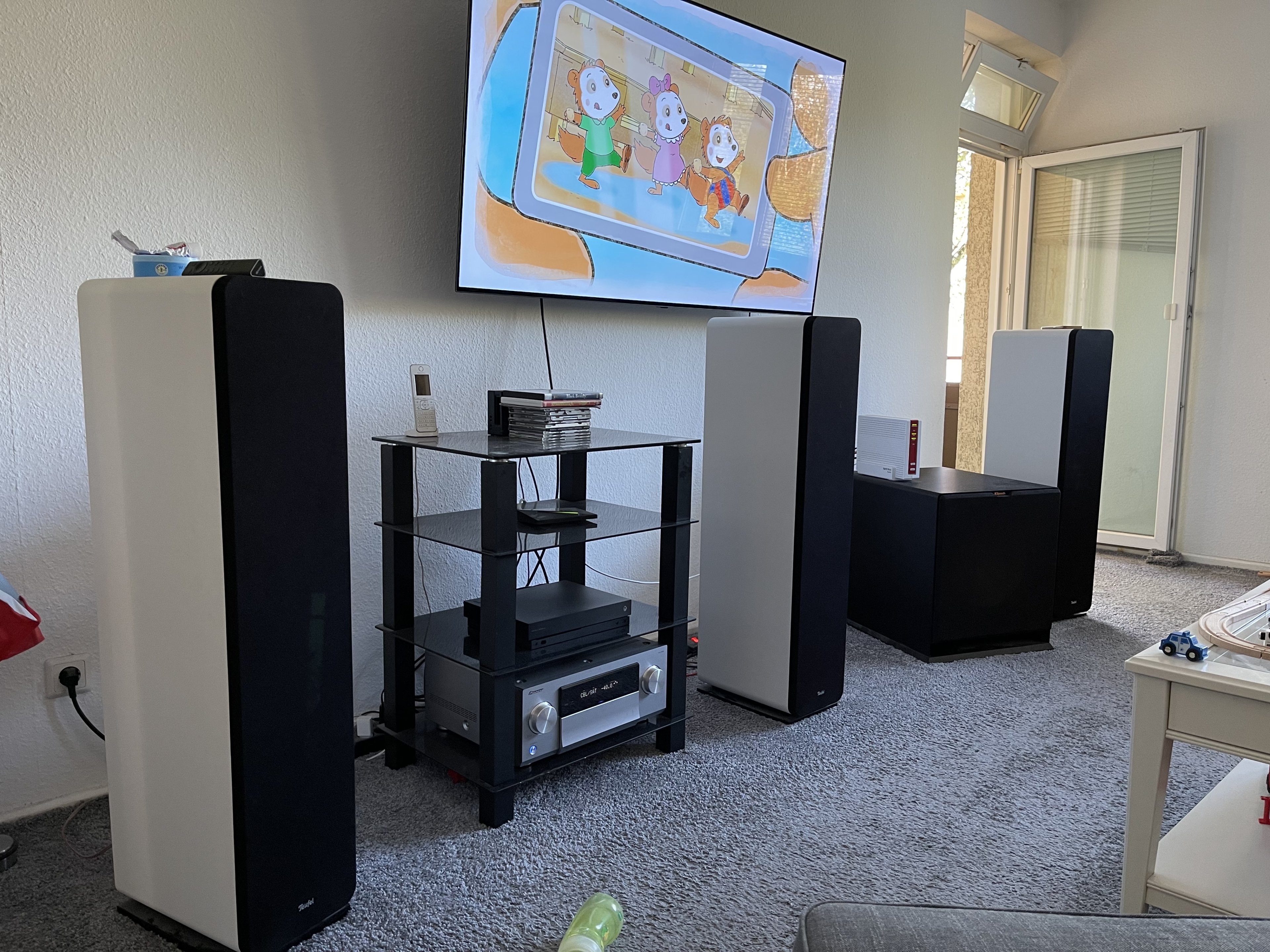 LS: Roon -> Raspi/Ropieee -> Nubert X-4000 RC + SW900 (Alternativ USB über einen versteckt verbauten NUC, der auch an dem TV hängt)