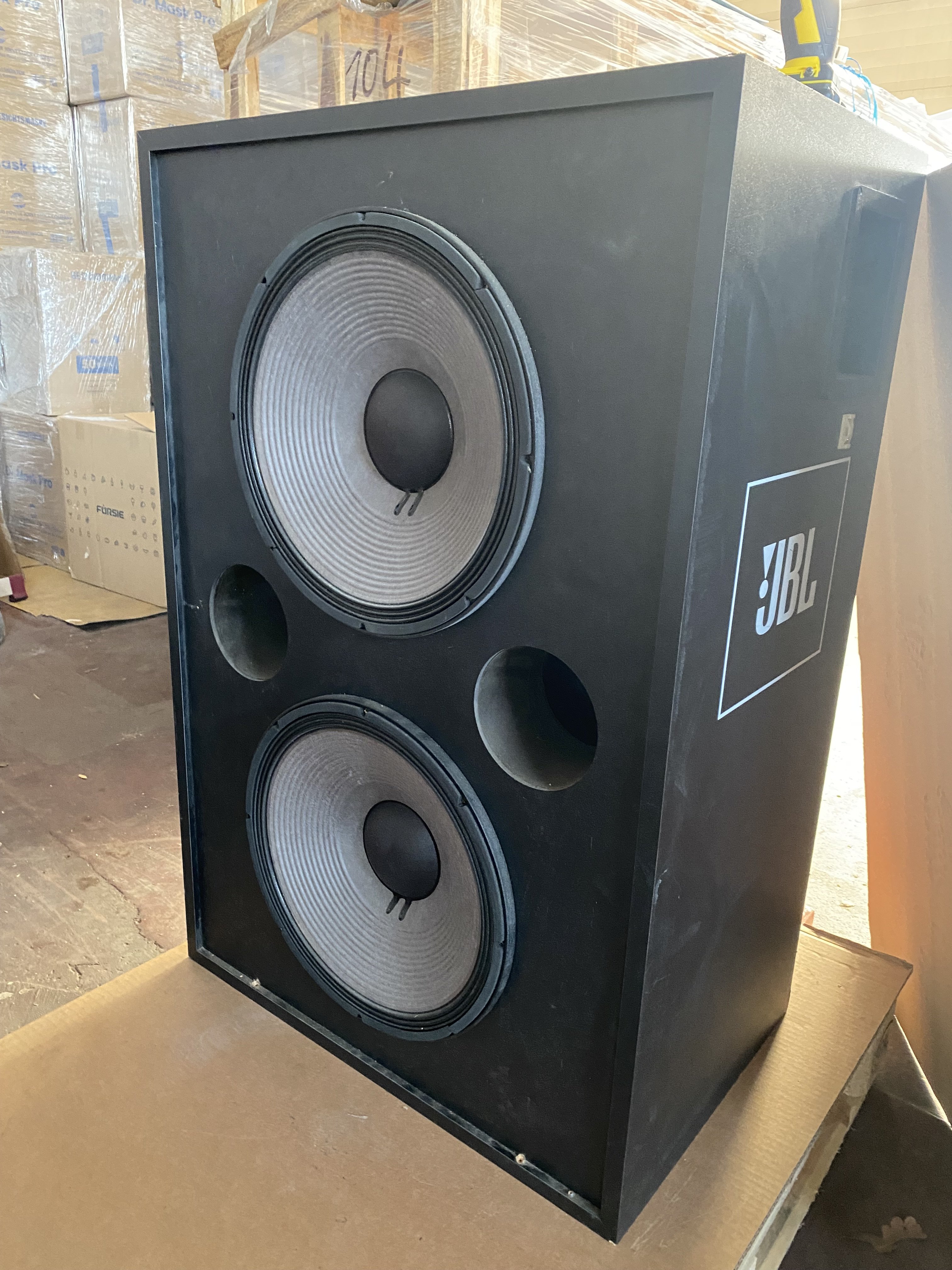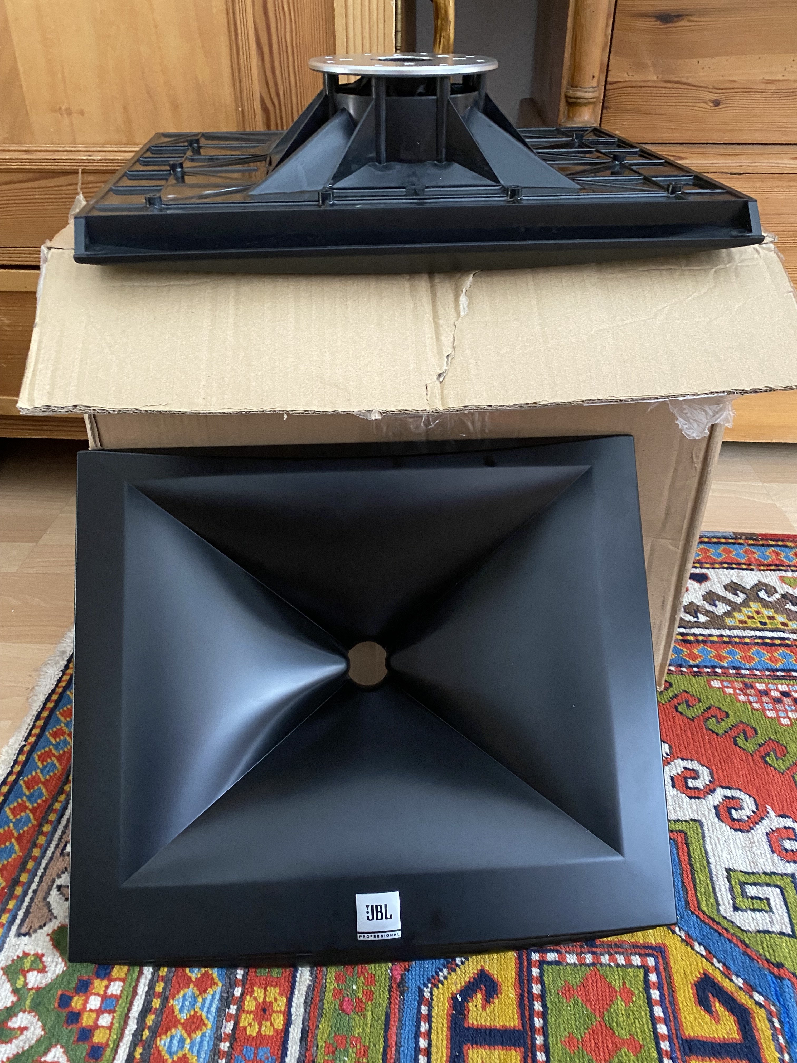 Lautsprecher sind aufgemöbelte Tiefmitteltoneinheiten aus einem JBL-Kinolautsprechern, statt dem riesigen Originalhorn sitzt da aber der etwas dezentere Waveguide aus dem JBL M2-Studiolautsprecher drauf. Die Waveguides habe ich in den USA bestellt. Tiefmitteltöner sind jeweils zwei 15"