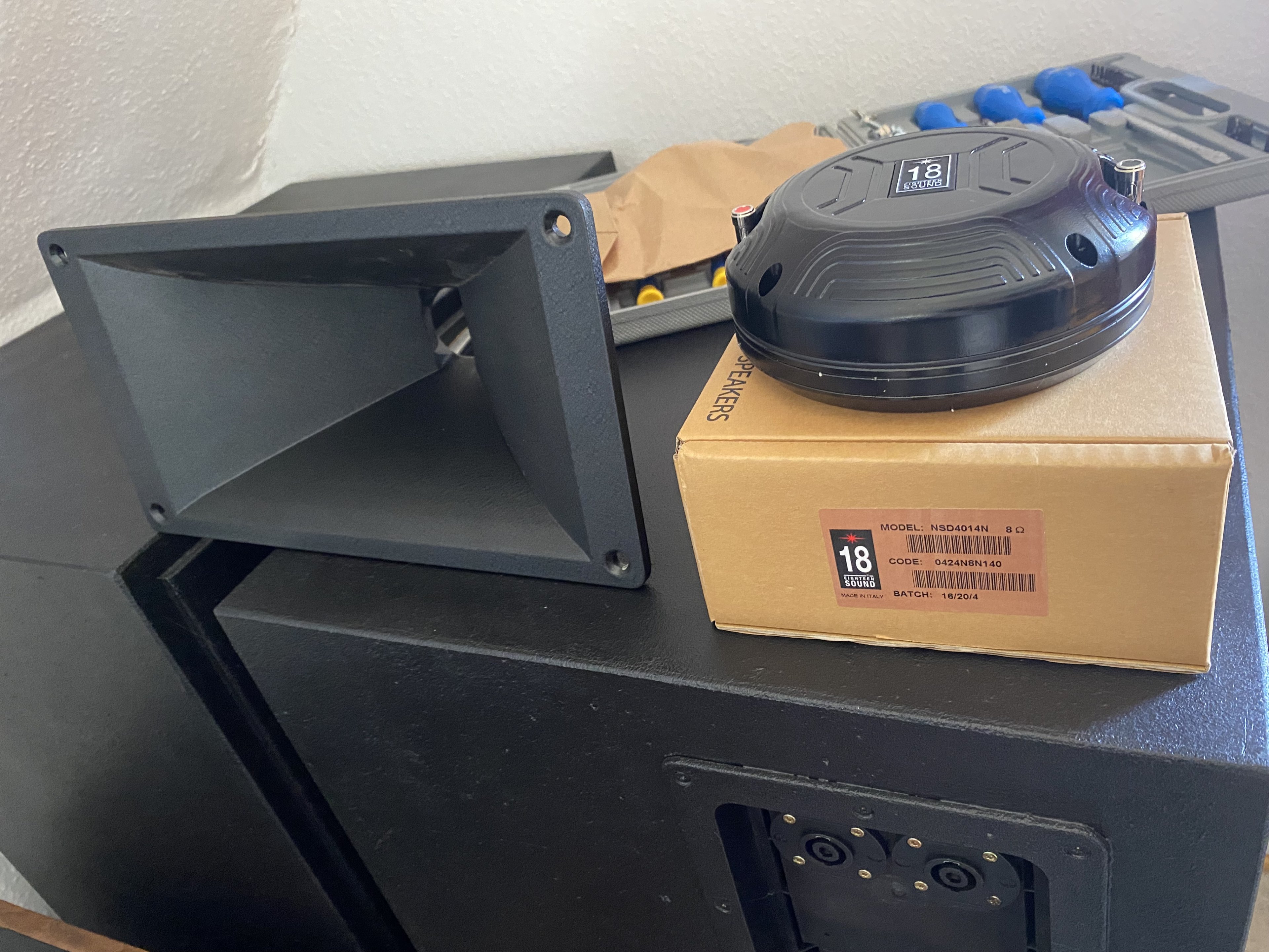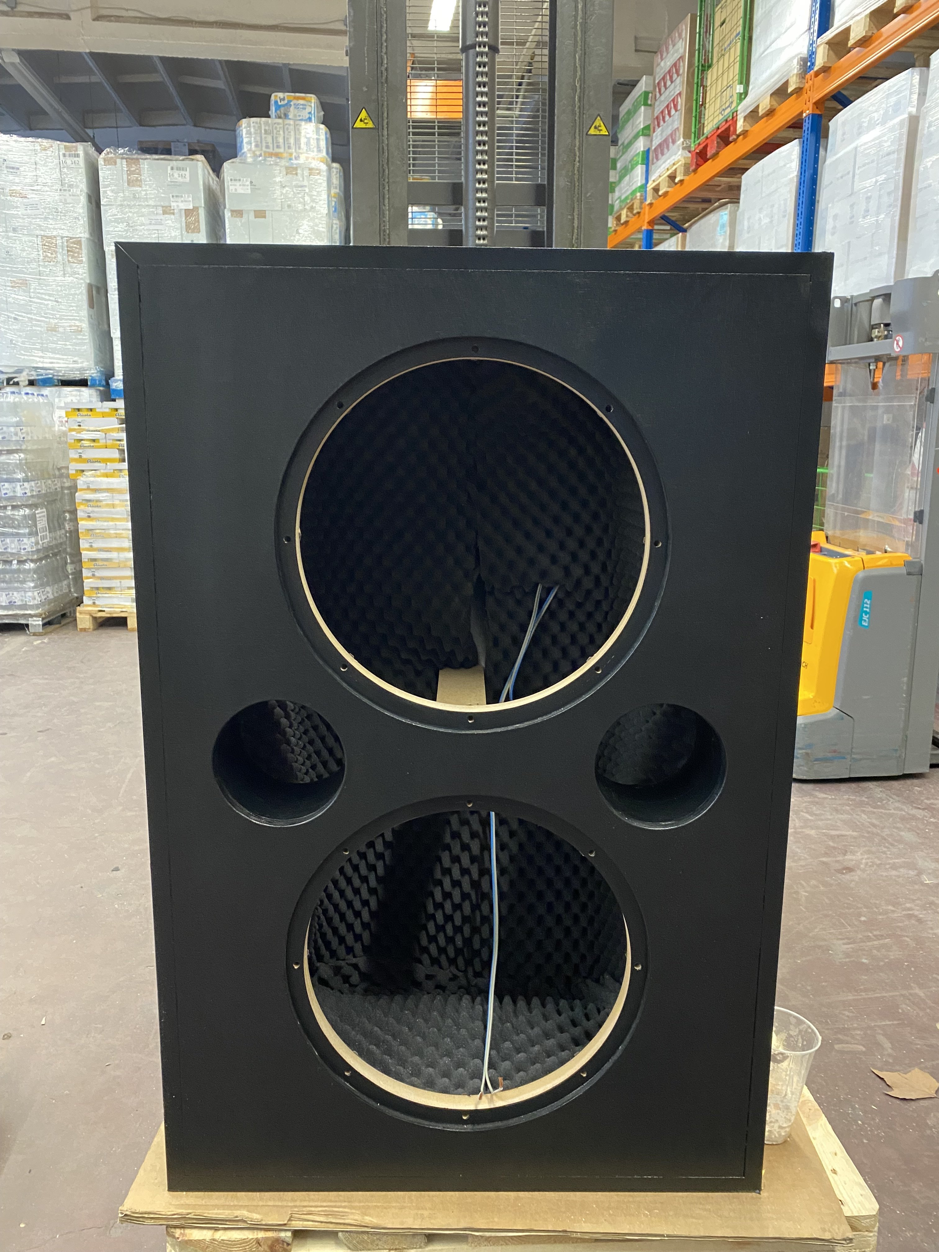 Im Schlafzimmer steht ein älterer Selbstbau von mir, pro Seite zwei 14" in D-Appolito Anordnung (auch wenn es keine nach Lehrbuch ist, so nah bekommt man die Chassis nicht zusammen), dazu dicker Kompressionstreiber am Holzhorn, der erlaubt eine Trennung bei 700hz zum Mittelhochtöner.