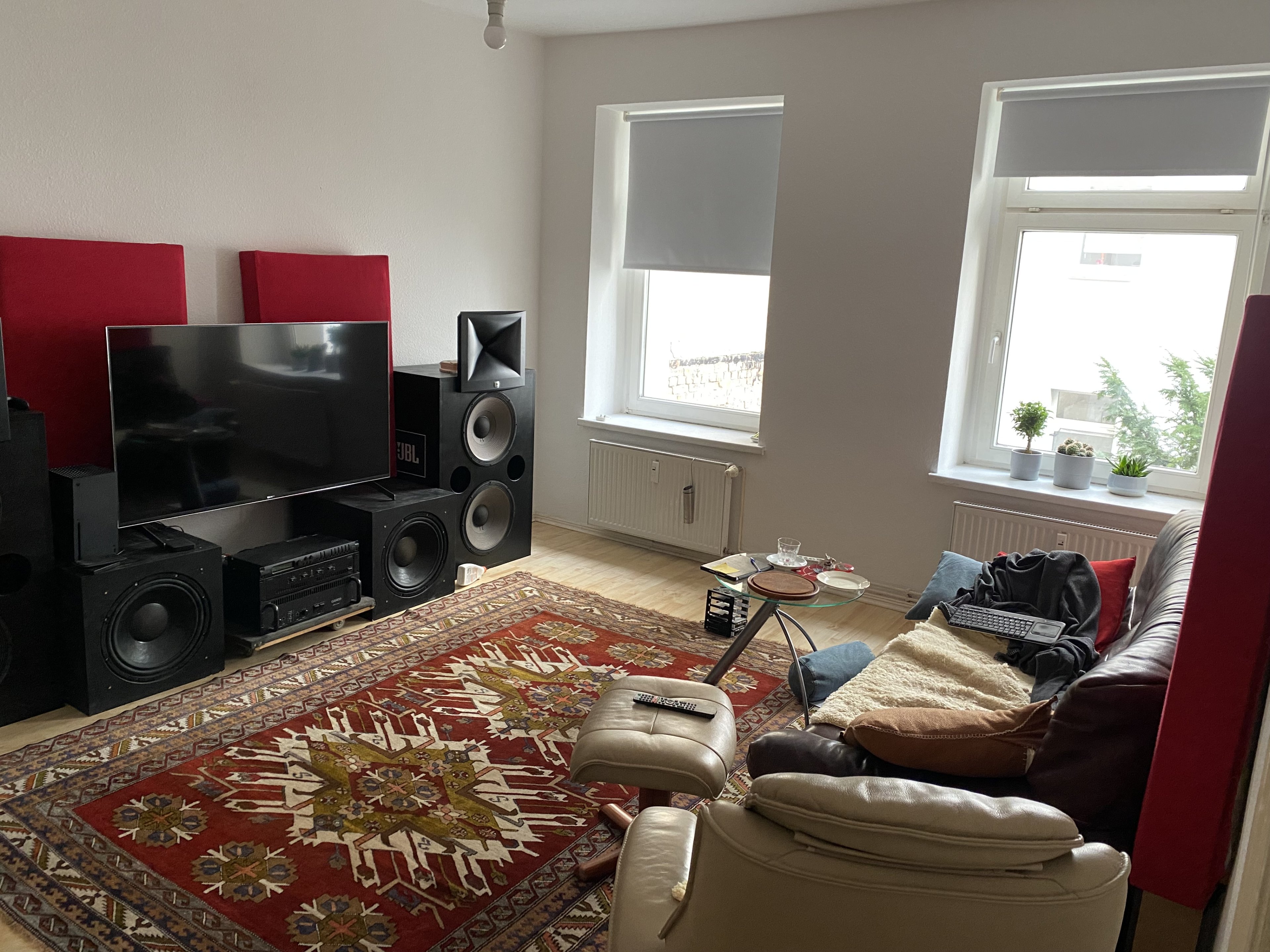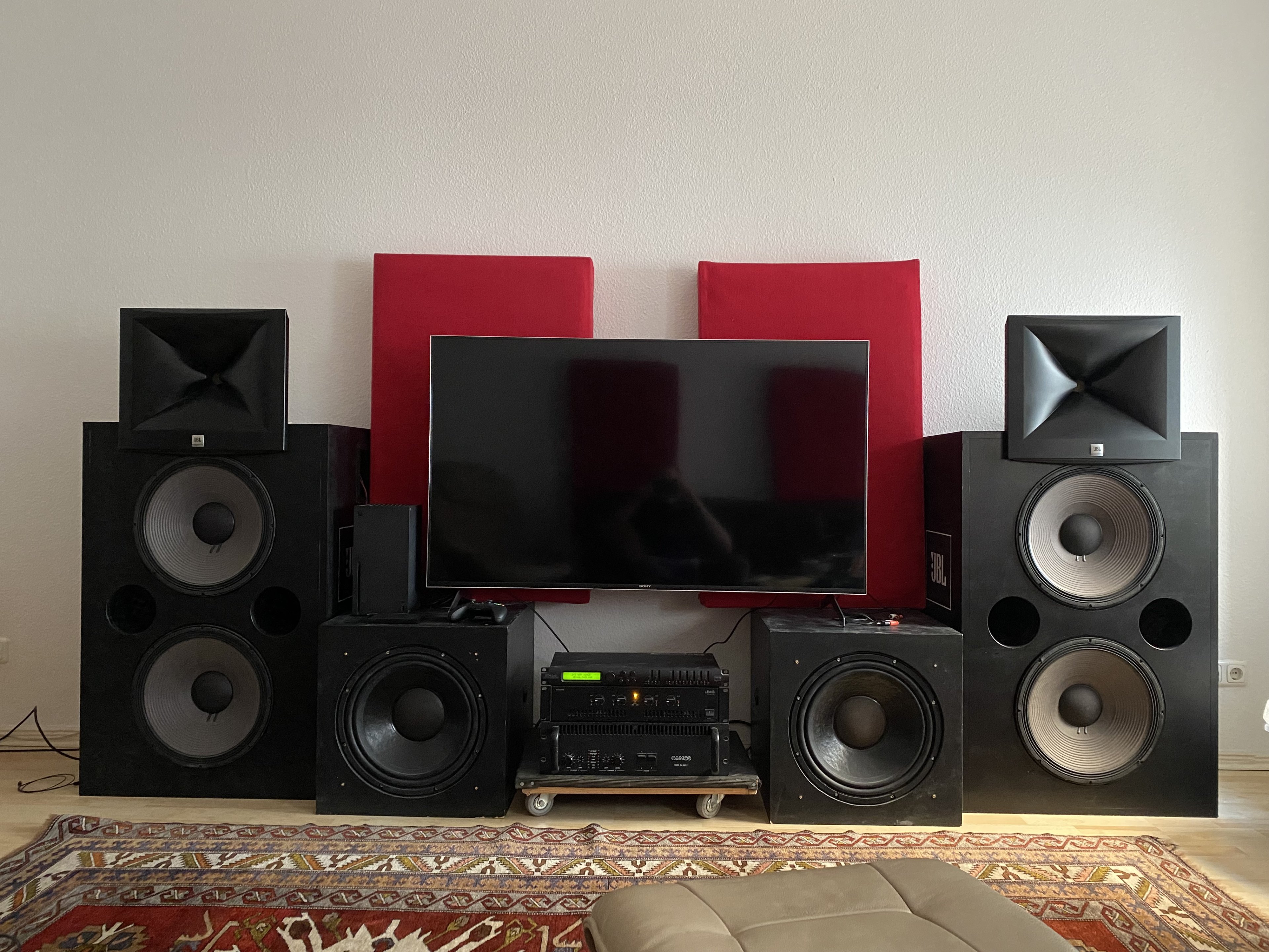 Und die große Heimkino-Anlage im Wohnzimmer. Der Raum hat 30qm, und ist recht lang, das Foto wurde aus der Mitte des Raumes aufgenommen. Primär für Musik, aber hier wird auch gezockt oder mal ein Film geschaut. Alle Lautsprecher aktiv. Der Raum ist akustisch stark gedämpft nach dem LEDE-Prinzip (vorne Absorption, seitlich und hinten Diffusion), sowohl mit gekauften, als auch mit selbst gebauten Modulen. In den hinteren Raumecken (nicht zu sehen) stehen noch große 50x50cm (Grundfläche) DiY-Absorber mit Thermohanf, die den Nachhall im Bassbereich ordentlich nach unten drücken. Eingemessen wird mit Audyssey, das liefert mir ausreichende Ergebnisse.