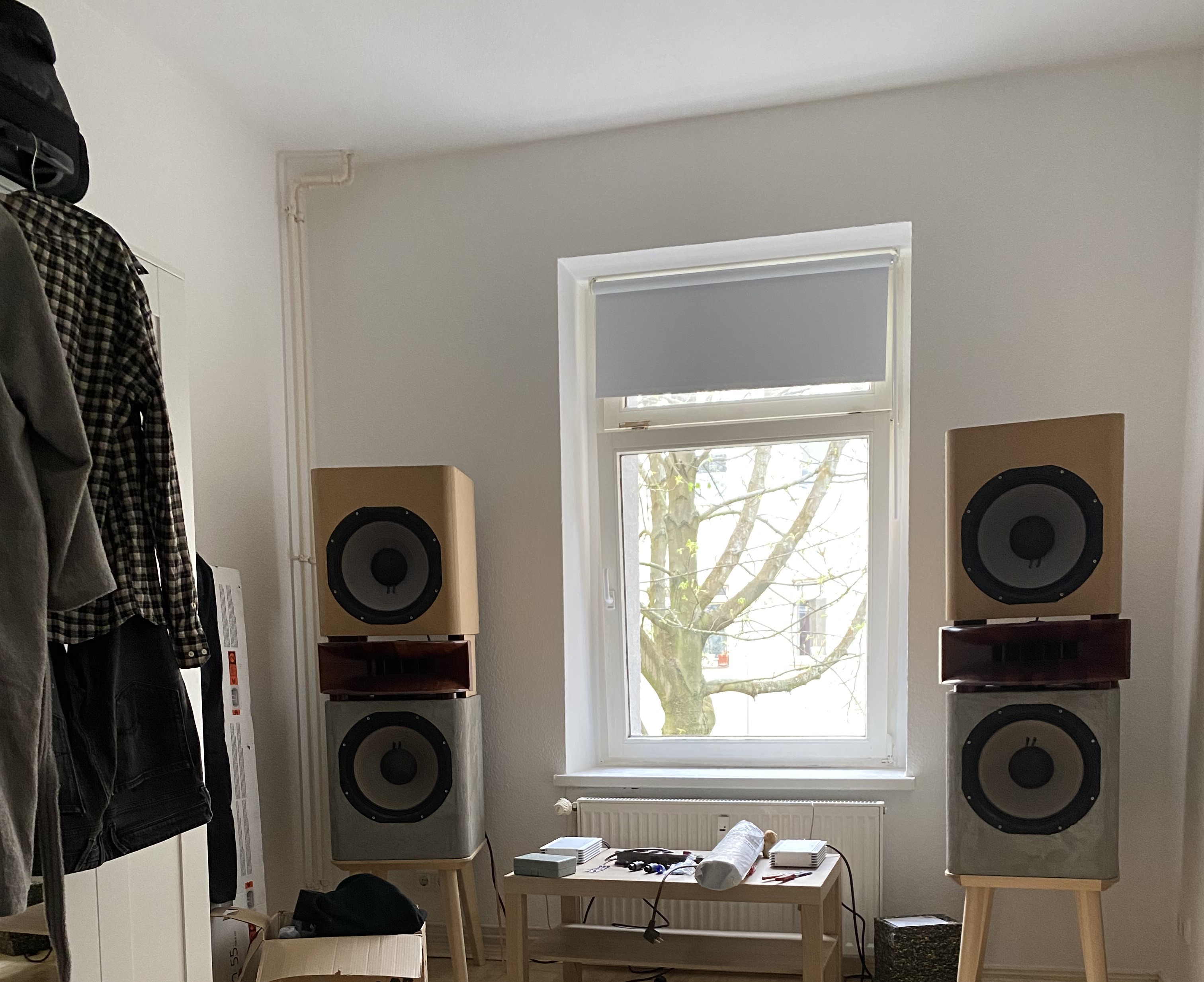 Die kleine im Büro. Der Raum ist nur 12qm groß. Gehört wird im Nahfeld mit etwa 1m Hörabstand. In den Ecken seht ihr einige Aborber, die bringen die Nachhallzeit unter 0,5 s. Der Subwoofer steht unter dem Schreibtisch und wird von einem MiniDSP, hinter das ich noch ein Antimode eingeschleift habe, entzerrt. An der Rückwand steht eine eTrap, das ist ein aktiver Absorber für die stärkste Raummode. Das Ding benutze ich aber selten, meistens zum Musik hören. Die Akustik ist sehr trocken, aber im Nahfeld mag ich das. Klingt wie ein großer Kopfhörer.