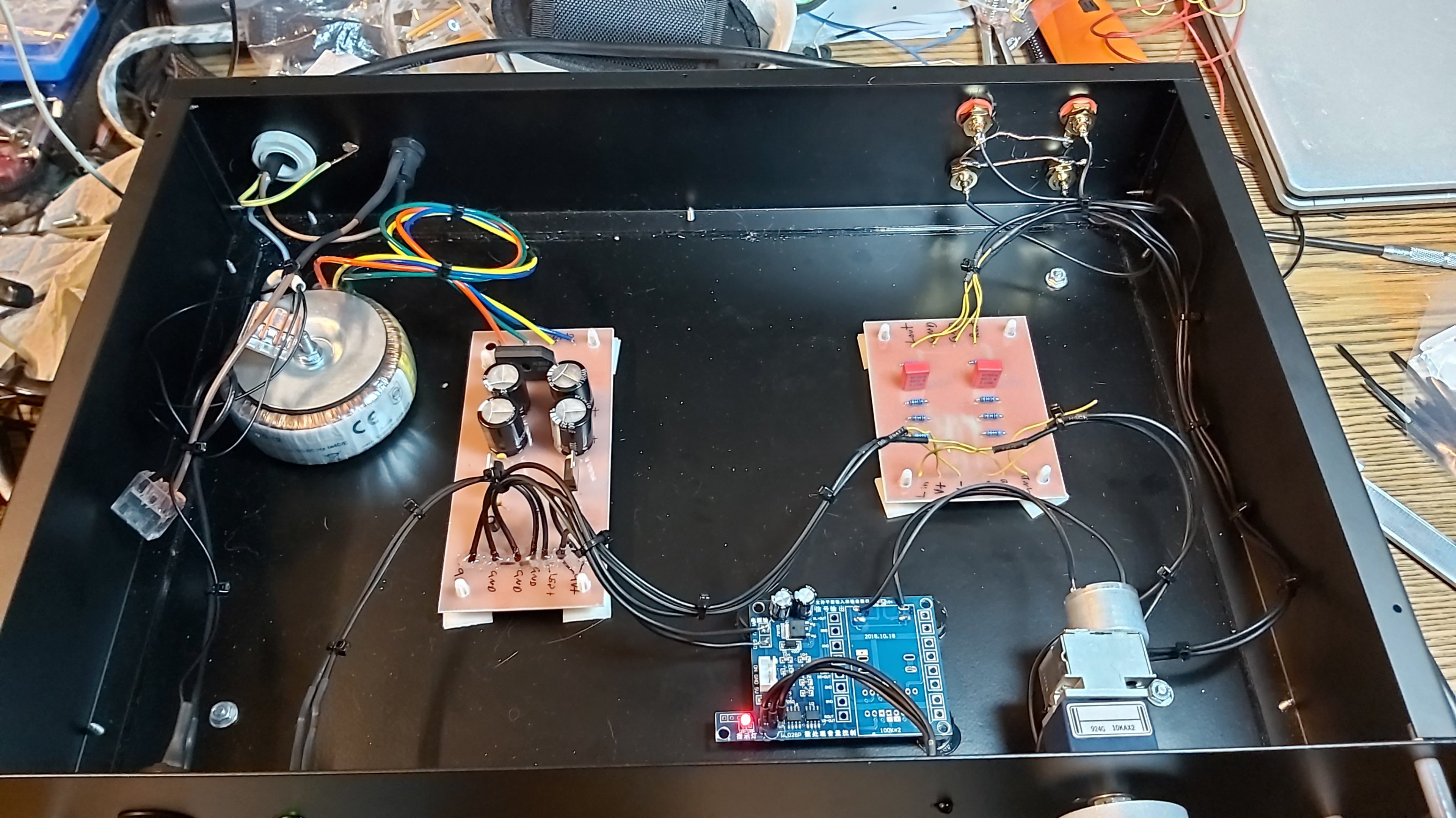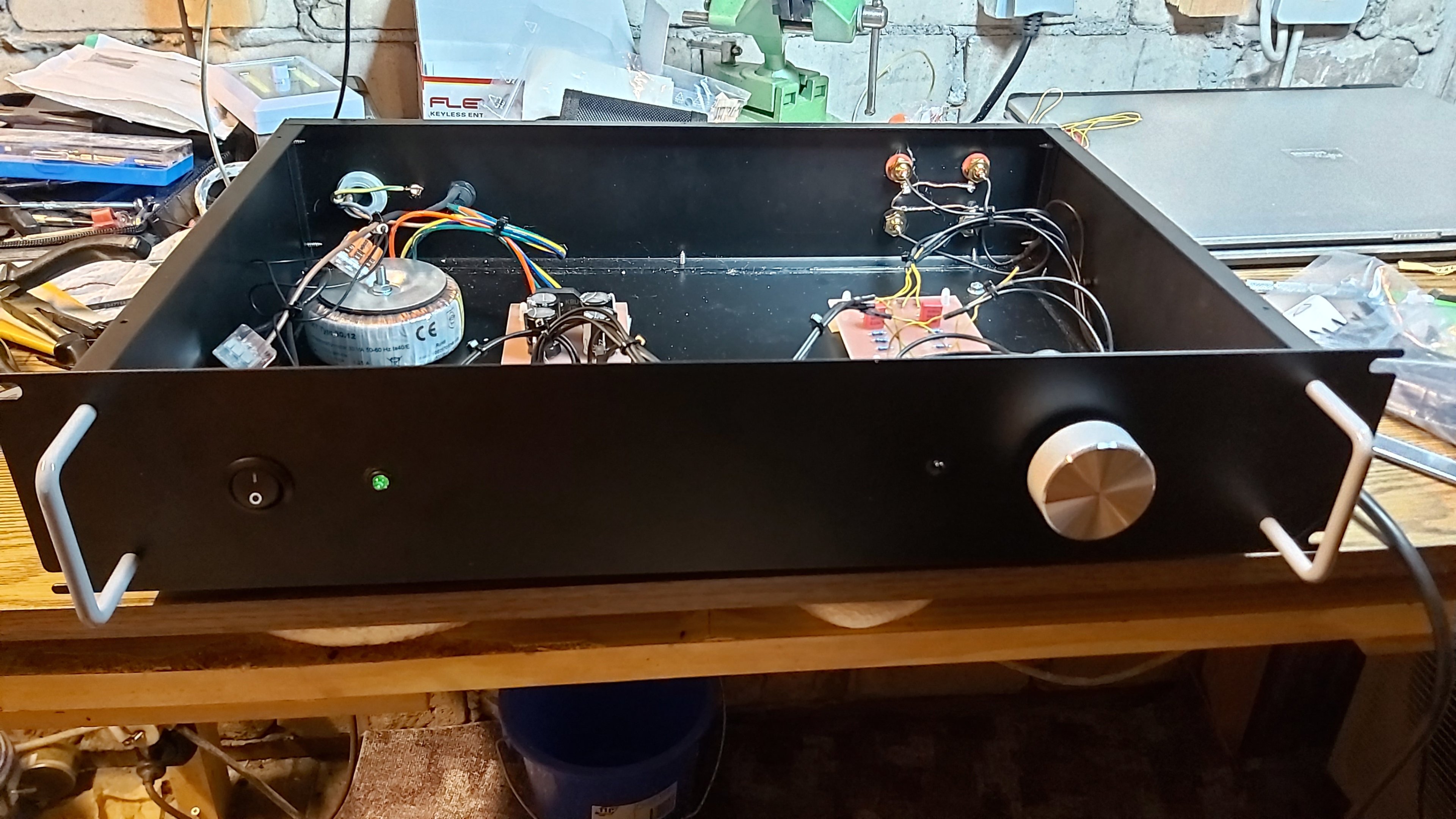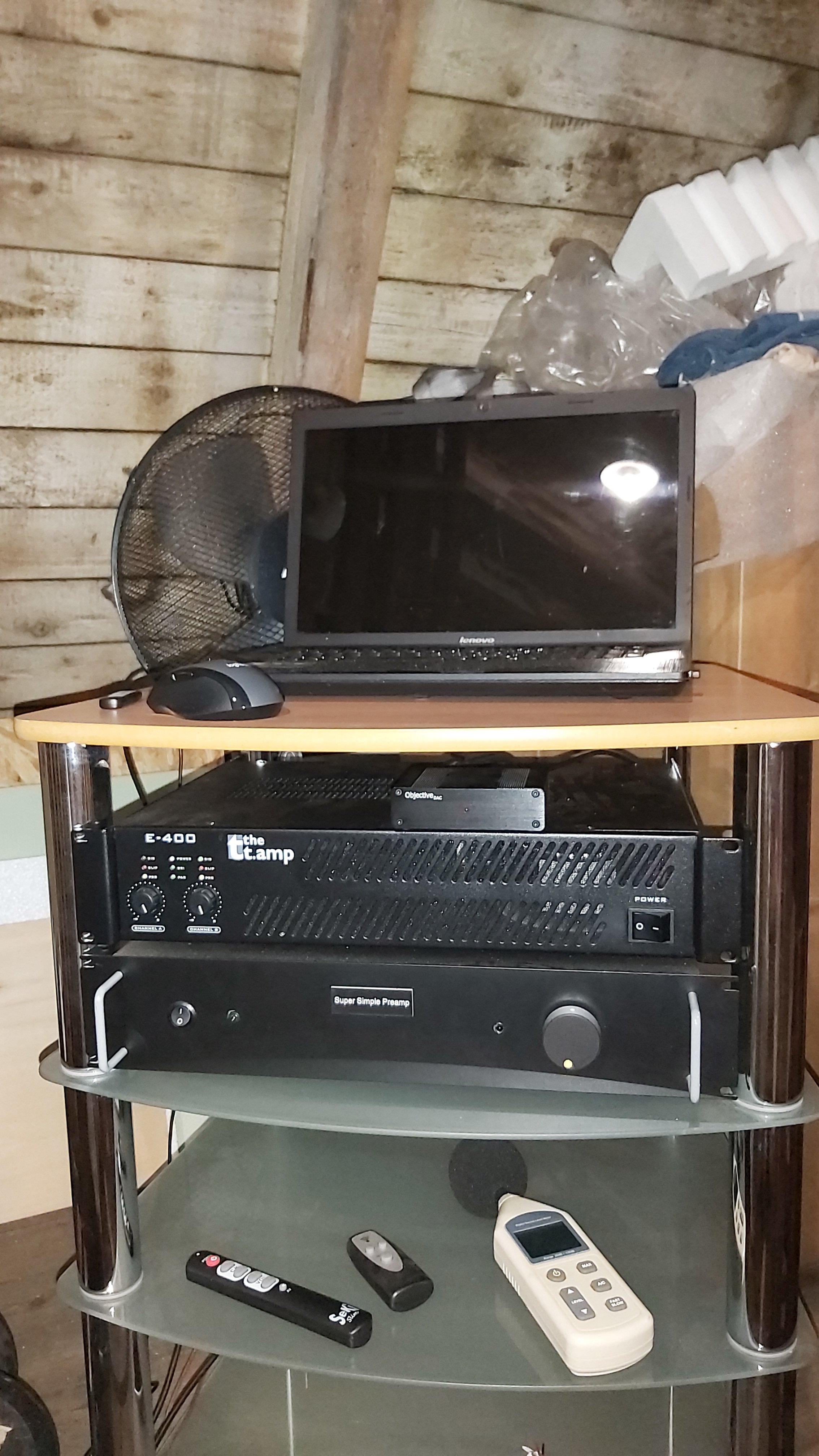An Elektronik braucht es nicht viel, alles läuft über den AVR. Das ist allerdings ein älteres Bild, inzwischen steht da ein Marantz mit Audyssey XT32.