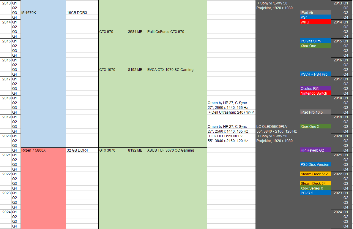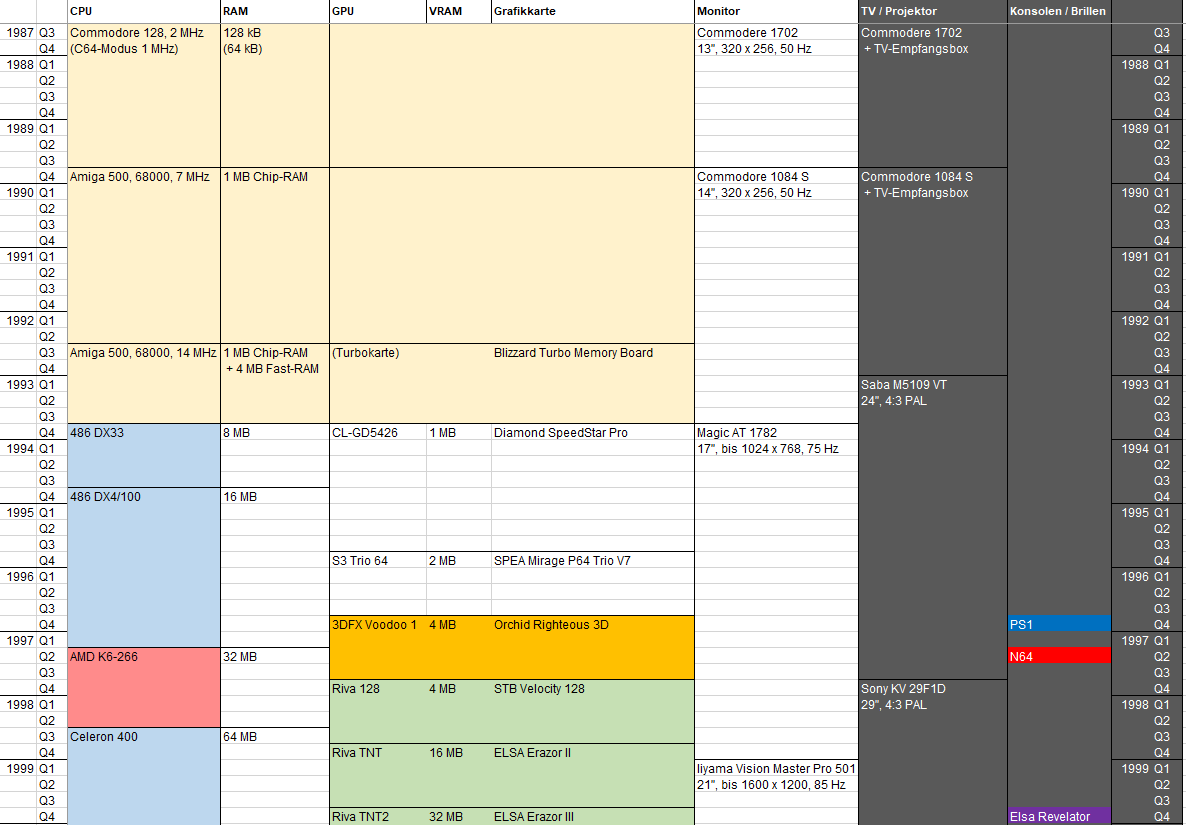VC20, C64 und Siemens Scenic 4H (486er) fehlen. Bei den Soundkarten bin ich nicht ganz sicher, ob zeitlich korrekt eingeordnet. Ich bessere ggf. noch nach. Alles andere schnell mal aus meiner Tabelle zusammenkopiert: