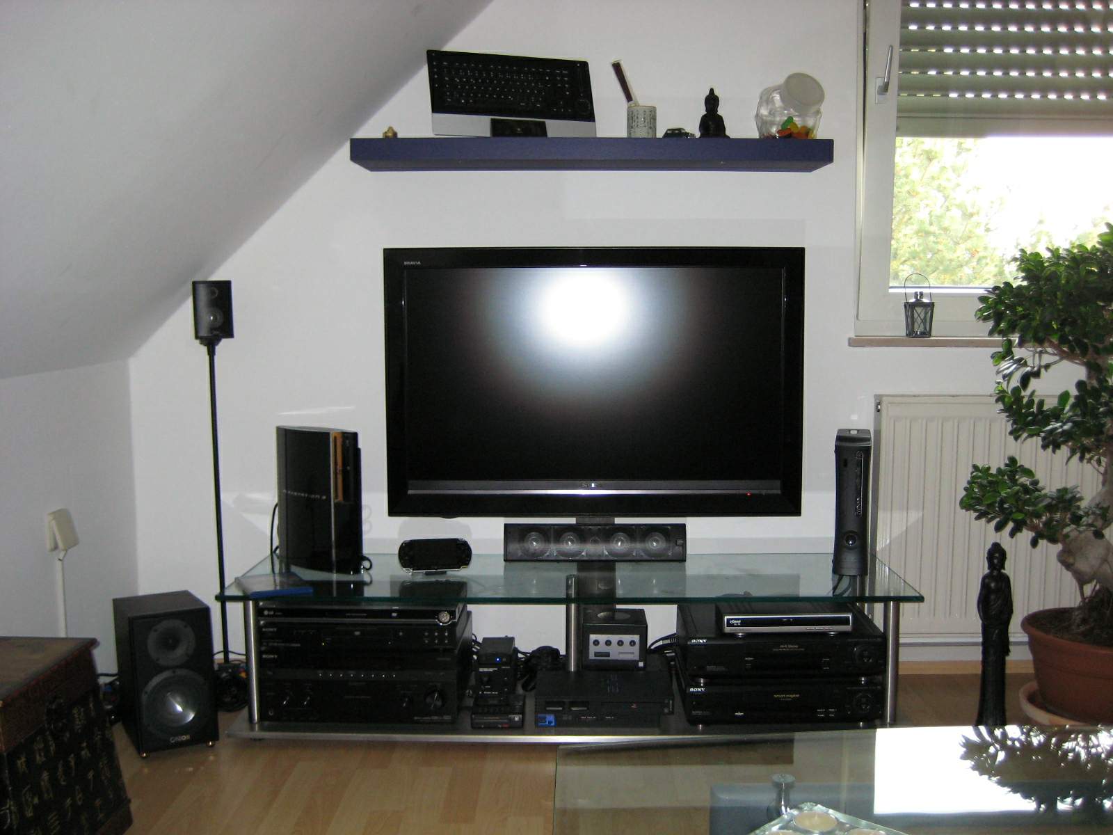 Am besten Gefällt mir das Gummibärengefäß auf dem Regal. Die Anlage ist schon eine Wucht. Allein die ganzen Konsolen. Fehlt aber noch die Wii.