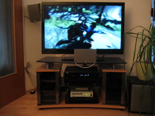 Ich würde den LCD an die Wand machen, etwas höher das die Center dann auch darunter passt. So ist es doch nicht so toll, da stört die nur.