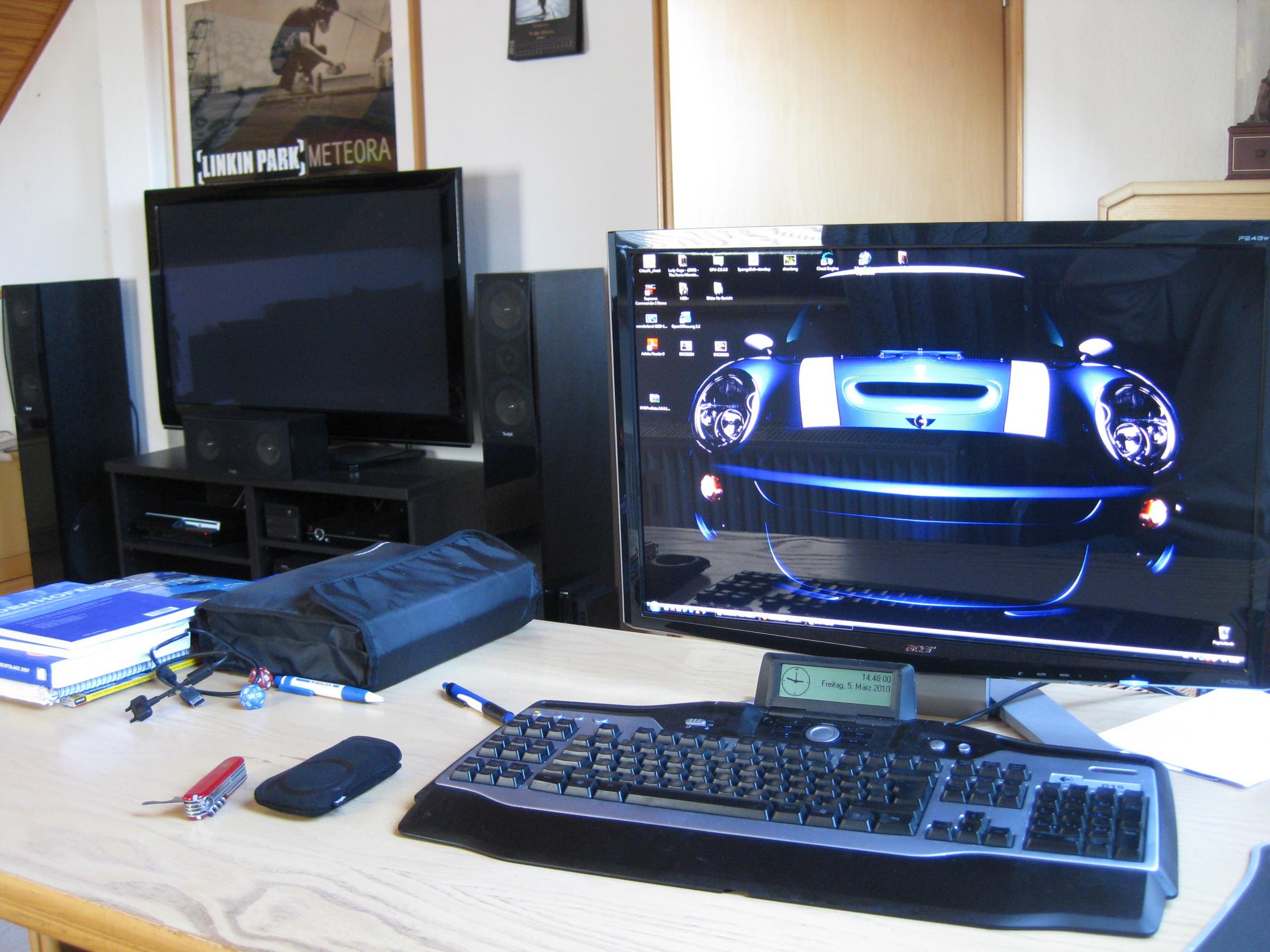 Die Boxen gehören zu einem logitech 2.1 System, da ich keinen anderen Platz dafür hatte, musste ich den subwoofer Links neben den tv Schrank stellen...