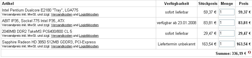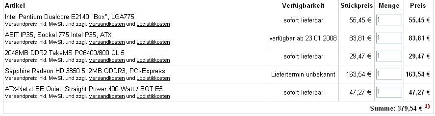 So... Das wars erst mal. Die CPU will ich erst mal Boxed nehmen. Auch mein 300W Netzteil will ich erstmal behalten (kostengründe). Das wird dann später nachgerüstet. Das Setup sollte aber schon einigermaßen für OC geeignet sein, da der 4600+ ja noch einiges an Potenzial hat genau wie die 8600gt. Alles in allem sollte das Kit die 300€ Grenze nicht überschreiten. Bin mit diesem Setup laut Alternate bei 301€...