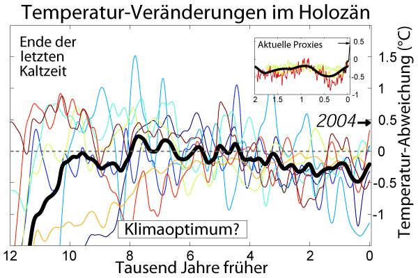 Das ist die Übersicht über den gegenwärtigen Zeitabschnitt. Die vergleichsweise milden, gleichbleibenden Bedingungen der letzten 10.000 Jahre erlaubten dem Menschen die Entwicklung hin zu dem, was er heute ist. Man sieht deutlich, dass die Temperatur in 10.000 Jahren etwa um 1°C gefallen ist bis wir mit dem Verbrennen der Kohlenstoffreservate angefangen haben.